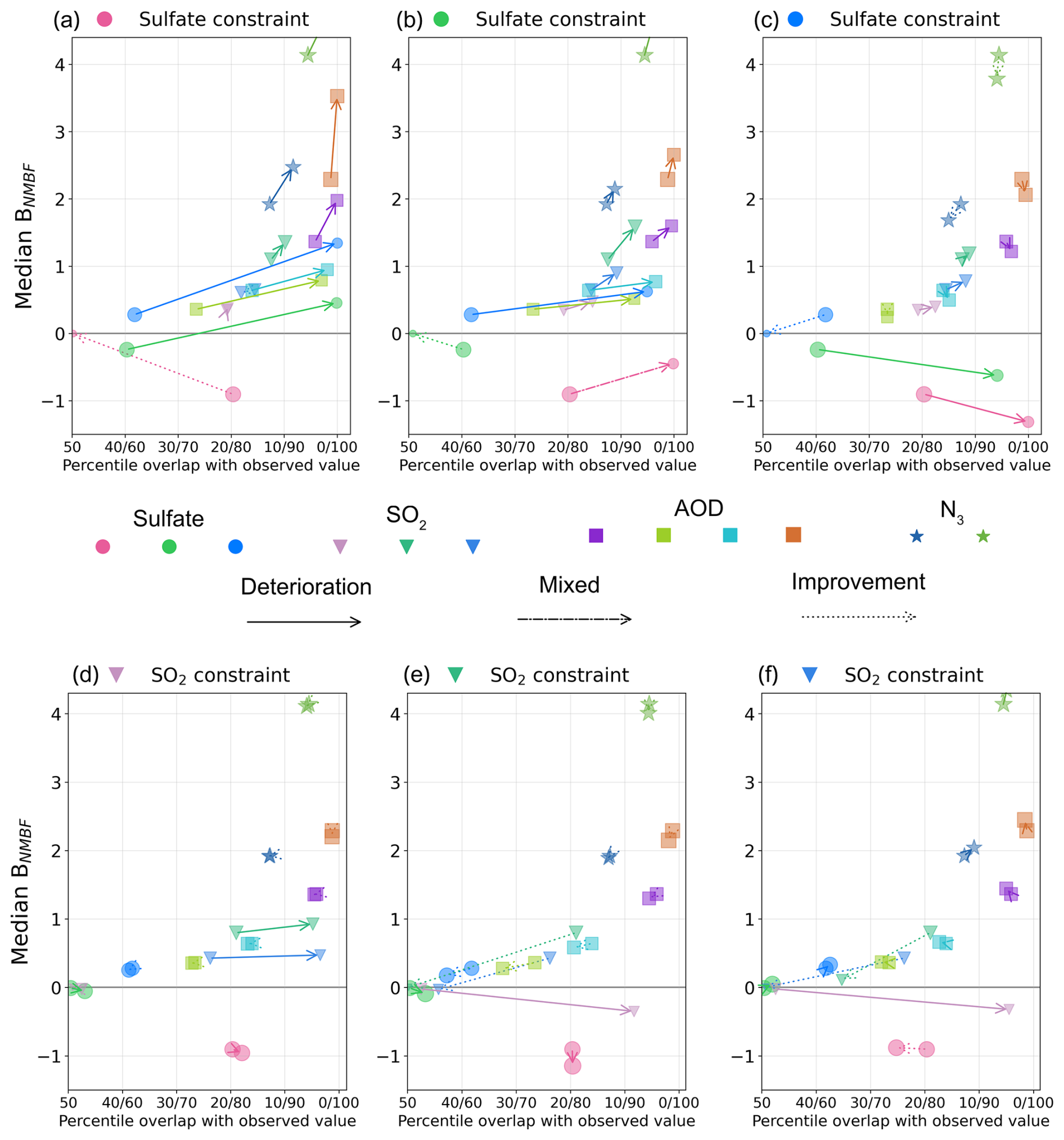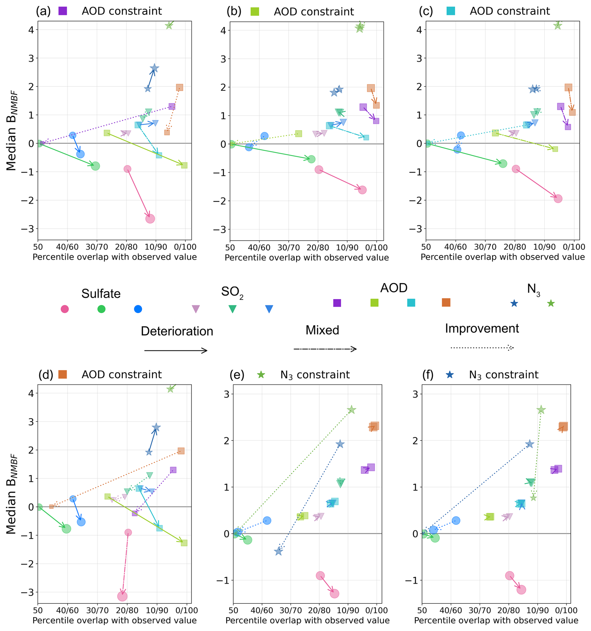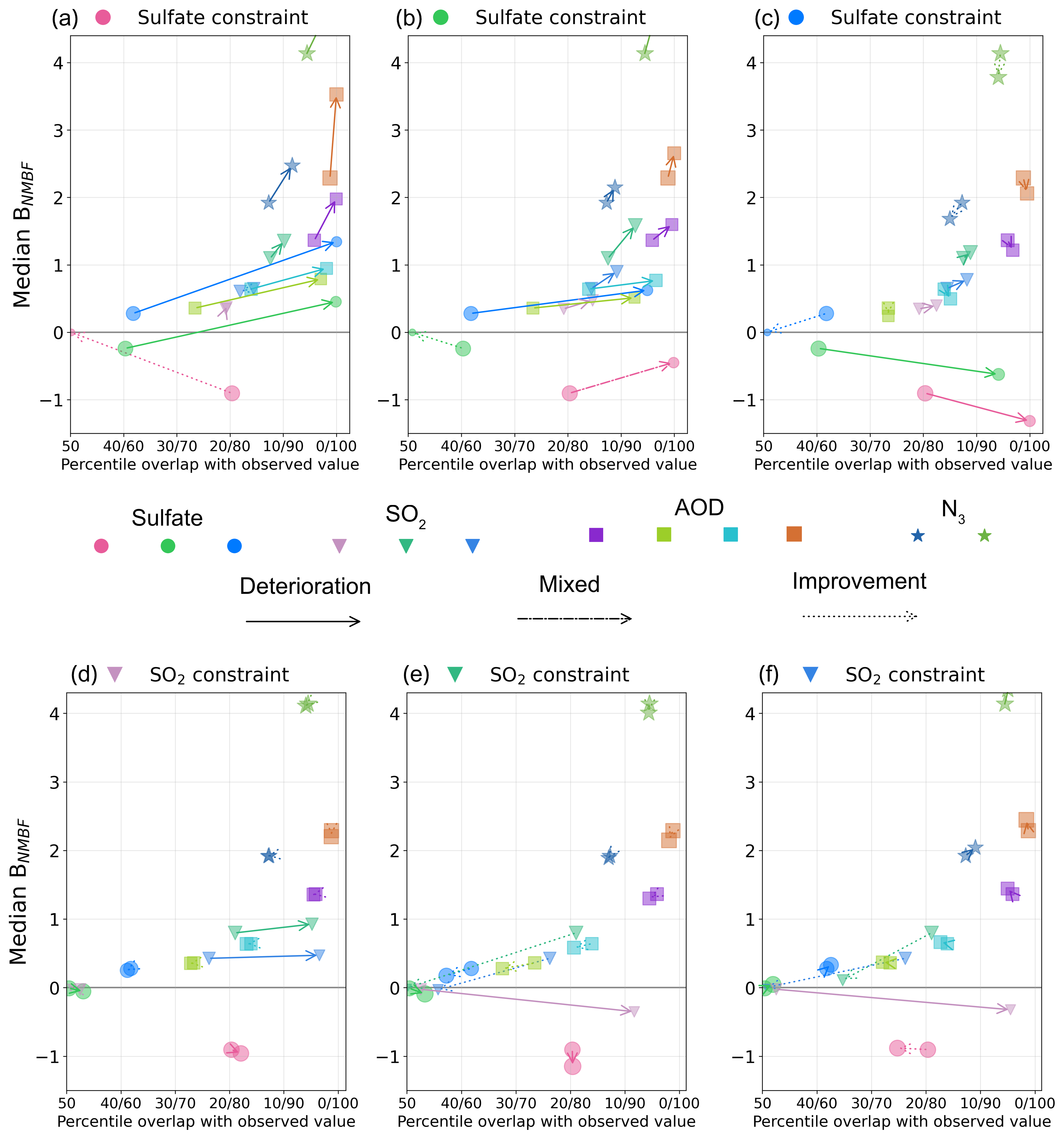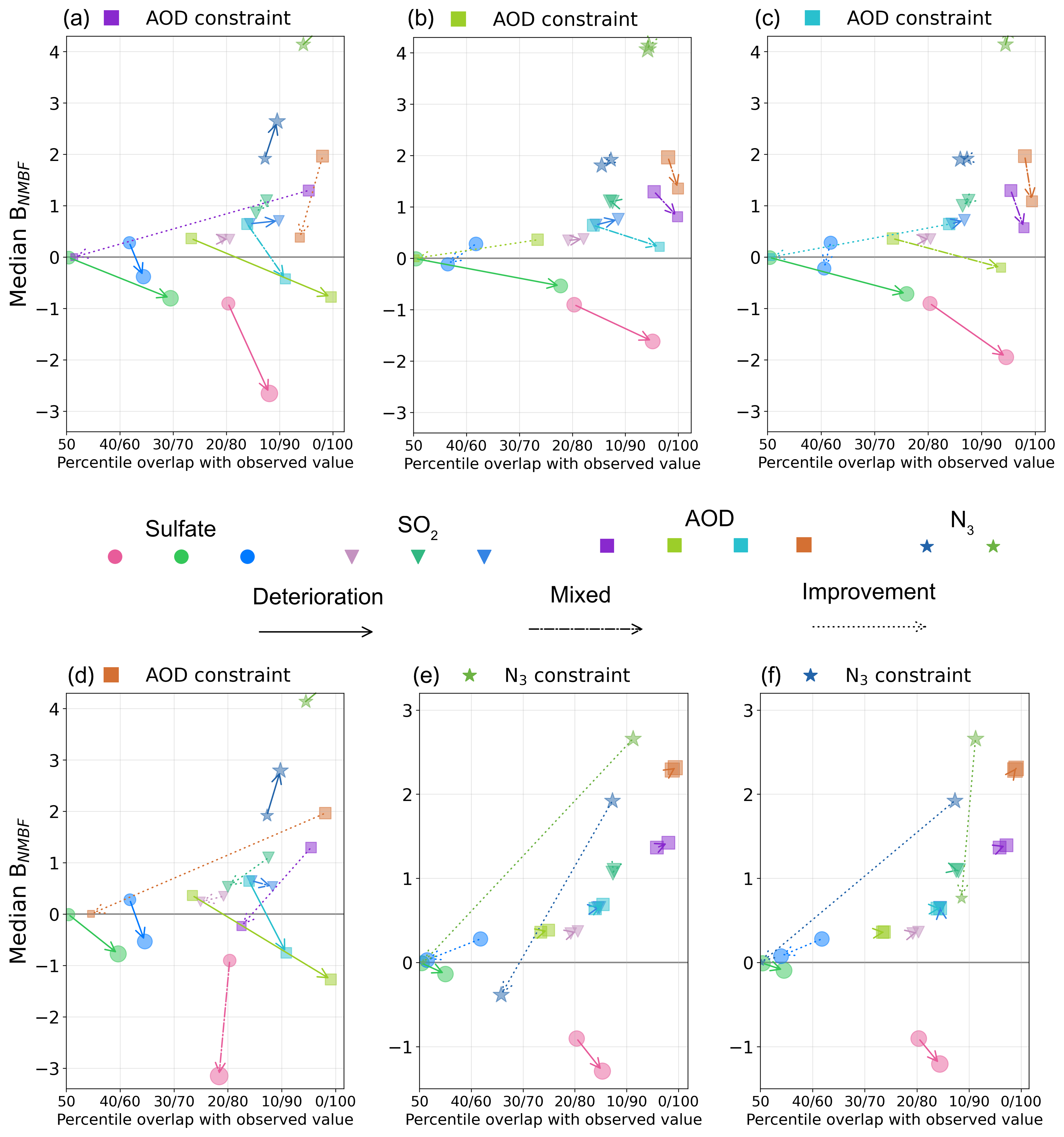 Figure 9 shows the effect of sulfate constraints presented in Fig. 7 on both precision and accuracy. In Fig. 9a, constraining the model to the observations in the pink cluster selects the variants closest to that observation. As a result, the pink arrow points to the origin, indicating near-zero mean bias and a percentile position of the observation near the centre of the constrained model distribution. However, the effect of this constraint on the green and blue clusters in Fig. 9a is to increase median BNMBF (shown by arrows pointing upwards) and to shift the observation's percentile position away from the distribution centre (arrows pointing to the right). The green and blue arrows point to , meaning that the observed sulfate concentration is outside the constrained distribution. The same pattern is seen in Fig. 9c when constraining to the blue cluster: Although the arrows point downward, they still move away from the zero line, indicating a larger (negative) median bias and reduced agreement. After applying the green constraint (Fig. 9b), the median BNMBF in the pink cluster improves slightly, but the observation is outside the constrained distribution, meaning that no model variants match observations in that region. In the blue cluster, both the median BNMBF and the percentile position of the observation worsen. So, improving agreement in one cluster worsens agreement in the other two.