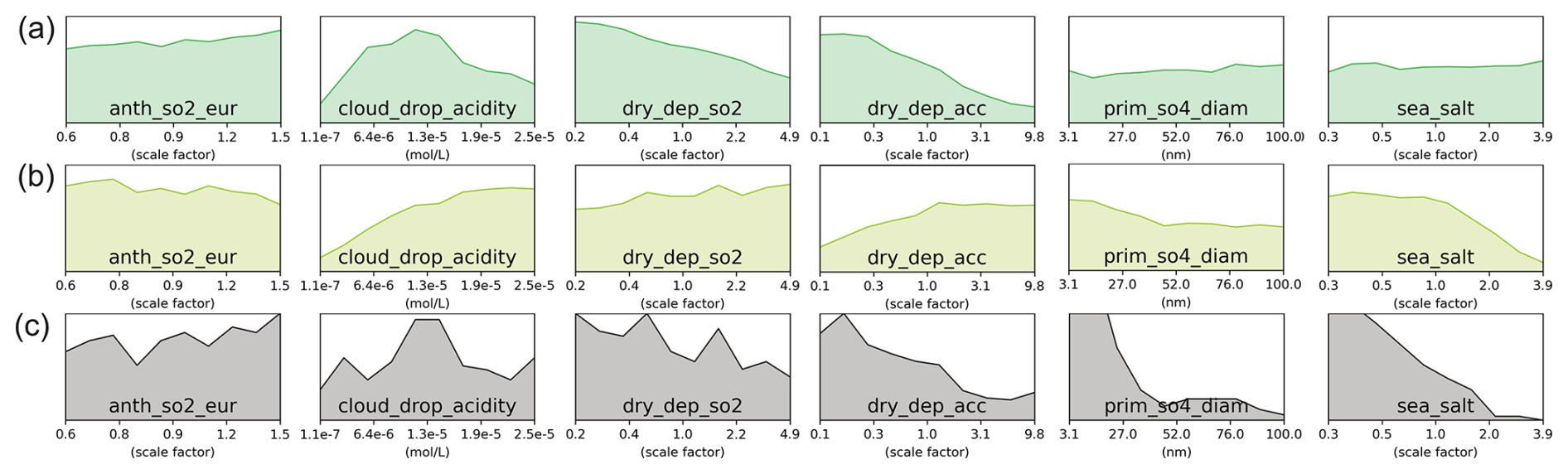 The GAMs were trained on the “unconstrained” subset of approximately 900 000 model variants, excluding those with prim_so4_diam values below ∼ 10 nm, as defined in Regayre et al. (2026). In the original ensemble comprising 1 000 000 model variants, such low diameters led to implausibly high particle number concentrations, which were ruled out as observationally implausible by Regayre et al. (2023). Including these variants would have artificially inflated the apparent importance of prim_so4_diam, thereby masking the contributions of other parameters (Regayre et al., 2026).