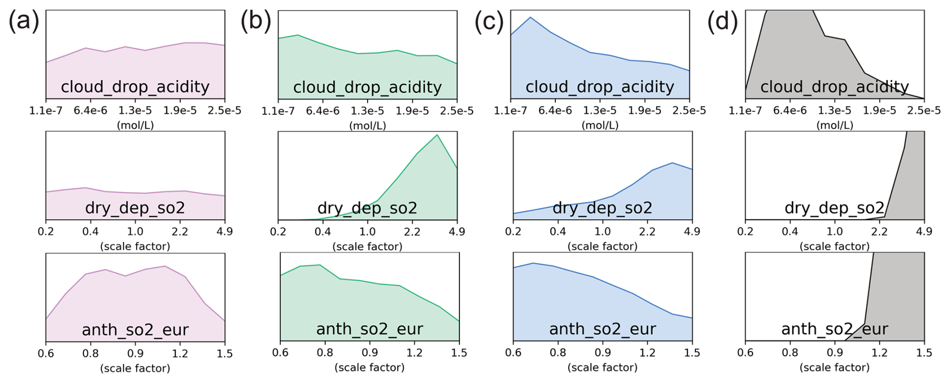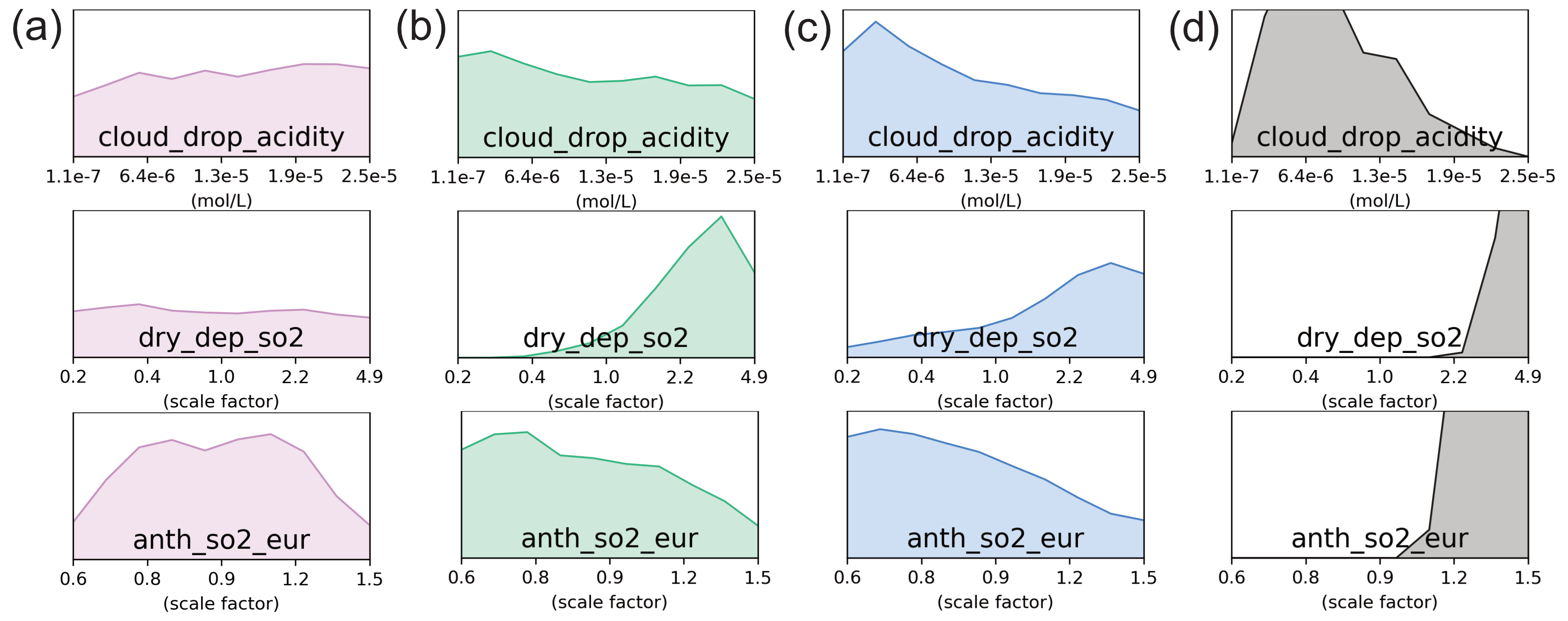 Figure 4b shows that SO2 concentration over Europe is mainly controlled by the regional anthropogenic SO2 emission rate parameter (anth_so2_eur) and parameters that affect its atmospheric lifetime by deposition (dry_dep_so2) or loss by formation of sulfate (cloud_drop_acidity). In Central Europe (green cluster), the most important contributors are dry_dep_so2 (65 %) and anth_so2_eur (18 %), which may reflect local anthropogenic emissions that likely drive the high SO2 concentrations seen in Fig. 2b. In Western Europe (pink cluster), anth_so2_eur is most important (46 %), consistent with moderately high anthropogenic emissions from the UK and Spain. In Scandinavia (dark blue cluster), anth_so2_eur is slightly less important (13 %), ranked third after dry_dep_so2 (50 %) and cloud_drop_acidity (30 %), which could reflect the more remote nature of the region. These same parameters drive uncertainty, in different combinations with other key parameters, in the grid boxes surrounding Spain (orange cluster), Eastern Europe (yellow cluster), and the marine (light blue) cluster.