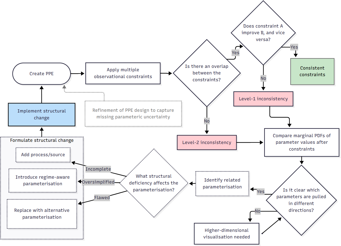 There has been growing interest in using PPEs not only to quantify parametric uncertainty, but also to reveal structural deficiencies that cannot be resolved by tuning parameter values alone (Carslaw et al., 2025). For example, Furtado et al. (2023) and Rostron et al. (2023) used PPEs to explore parametric uncertainty in their models and detect discrepancies that persist across all parameter combinations. Couvreux et al. (2021) proposed a parameter calibration framework to identify parameters which limit model performance by introducing structural uncertainty, to be implemented during model development and tuning. Peatier et al. (2024) examined how variability across PPE simulations could provide information about the presence of structural error. Despite these innovations, there is currently no agreed framework to identify structural deficiencies that lead to conflicting observational constraints, and thus block progress in reducing parametric uncertainty. Moreover, little attention has been given to identifying which model developments should be prioritised to most effectively improve model skill at simulating future climate. Without such a framework, there is a risk that model developments increase model complexity without delivering clear benefits (Proske et al., 2023).