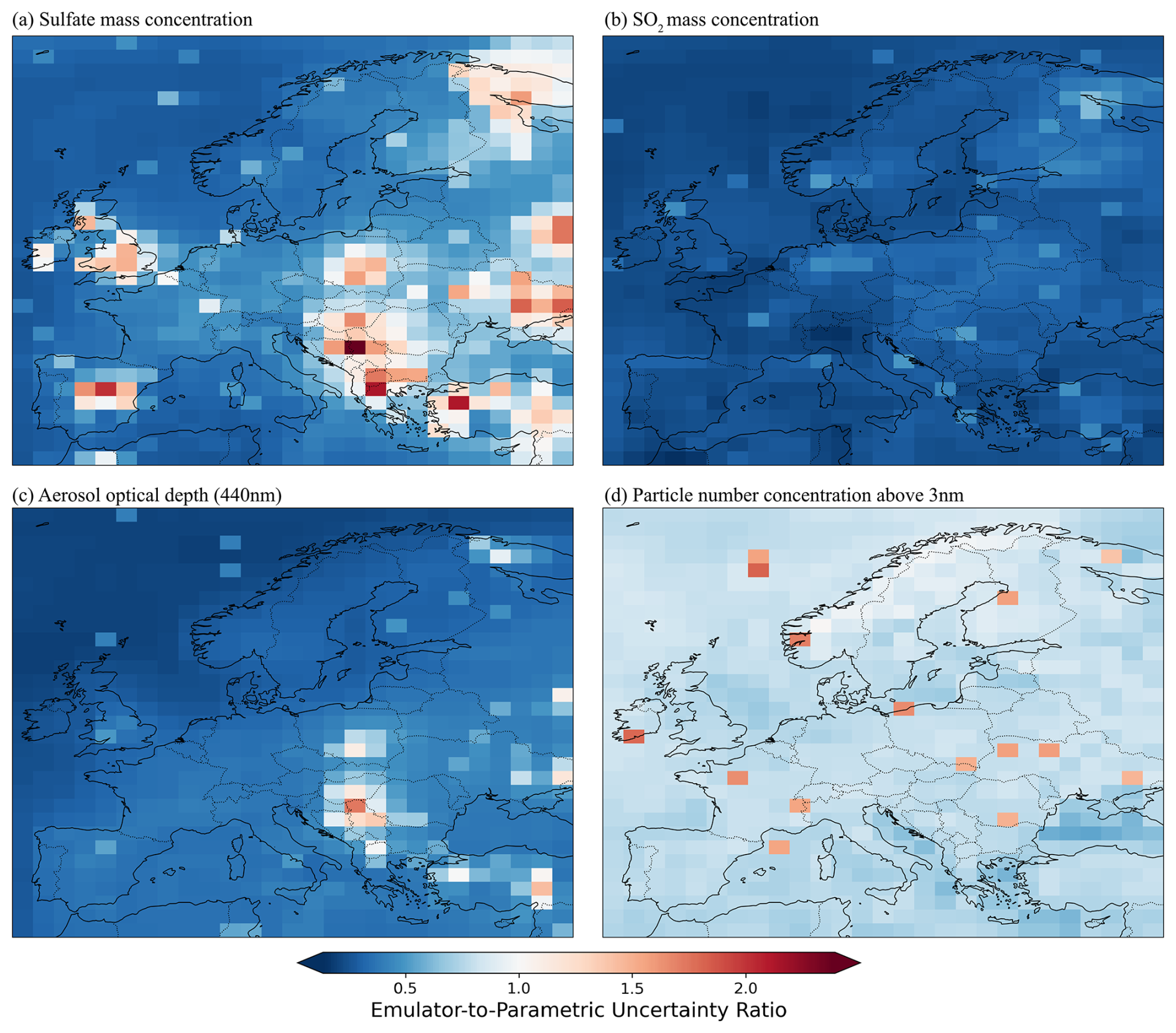 Here, model output from the 221 PPE simulations, resolved at the grid-box level across Europe in January 2017, was used to train statistical emulators for four variables related to aerosol–radiation interaction forcing: sulfate aerosol mass concentration (“sulfate”), sulfur dioxide concentration (SO2), aerosol optical depth (AOD), and particle number concentration larger than 3 nm diameter (N3). Gaussian Process emulators (O'Hagan, 2006) were constructed to represent the monthly mean of each variable as a continuous function across the 37-dimensional input parameter space, with each parameter jointly varied over its specified range (shown in Table A1). The emulators were then used to generate output for 1 million model variants at the grid-box level, with a large reduction in computational cost compared to full climate model simulations. Emulator uncertainty was quantified and assessed against the spread of emulator output (Fig. B1). Grid boxes where emulator predictive uncertainty exceeded the spread in emulator output were excluded from the analyses to avoid relying on emulator predictions in regions of high predictive uncertainty.