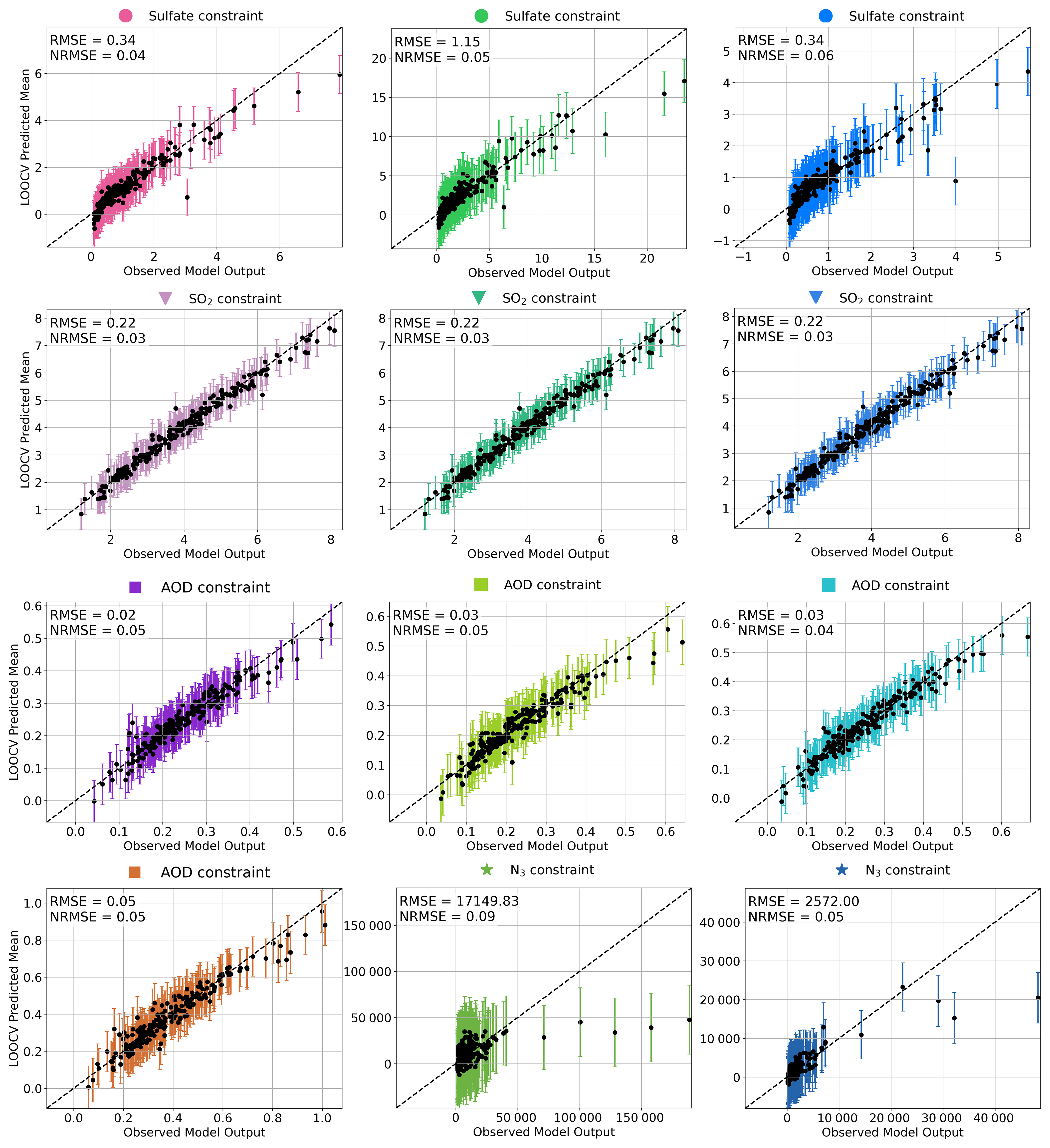 We evaluate model performance against observations within each cluster of shared causes of parametric uncertainty. For each PPE simulation, we compute the mean model value over the set of grid boxes containing observations within the uncertainty cluster, resulting in a cluster mean for each of the 221 PPE members. These cluster mean values are then used to train and validate the emulator for each cluster (Fig. B2). Leave-one-out cross-validation indicates that the emulators reproduce cluster-mean PPE outputs with high accuracy overall (e.g., NRMSE ≤ 0.09), although some underprediction occurs for high values in certain clusters (e.g., sulfate and N3). These biases suggest that true values in these regions may be higher than emulated estimates; however, given the focus on relative differences across clusters, these limitations are unlikely to affect the main conclusions.