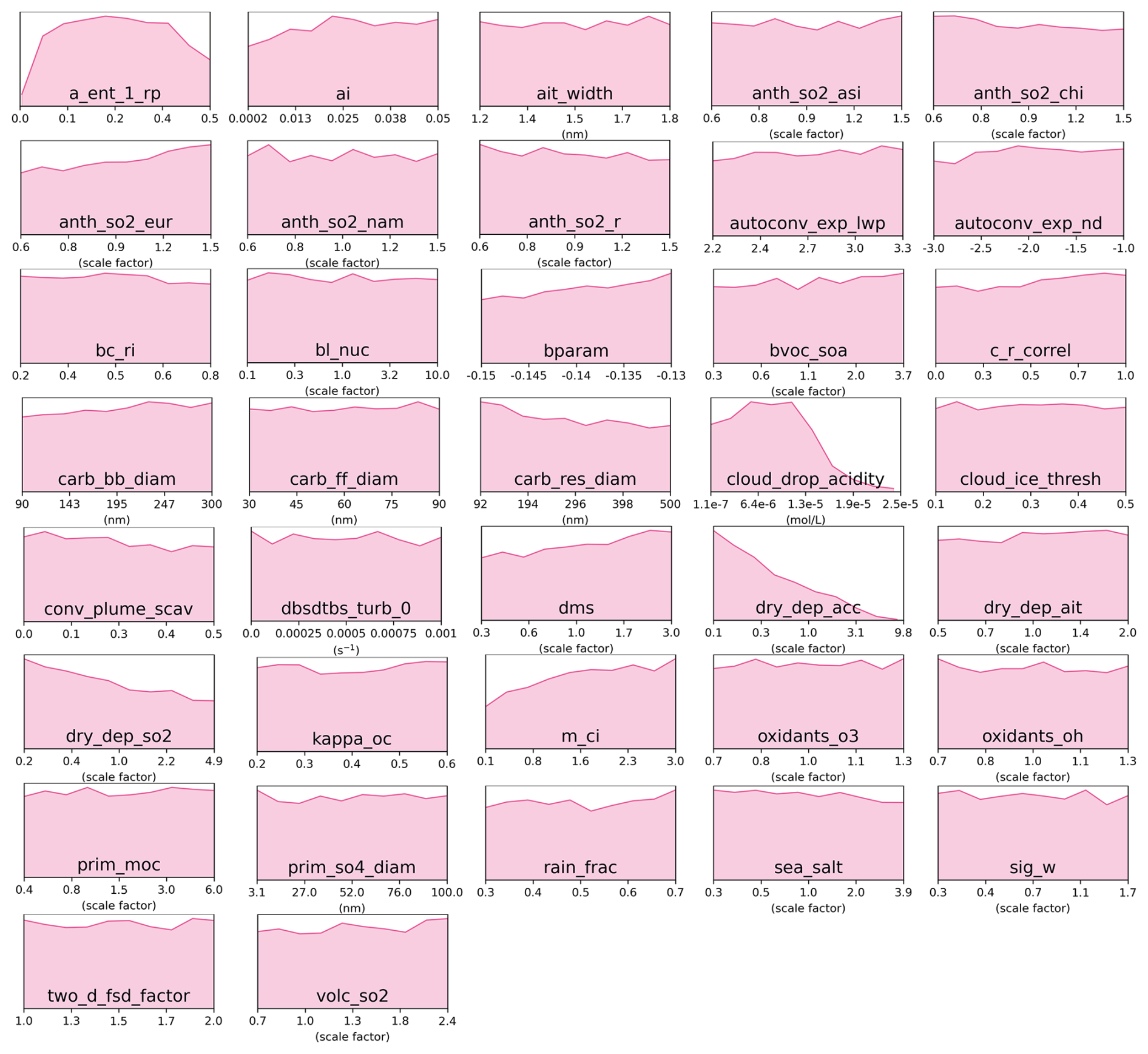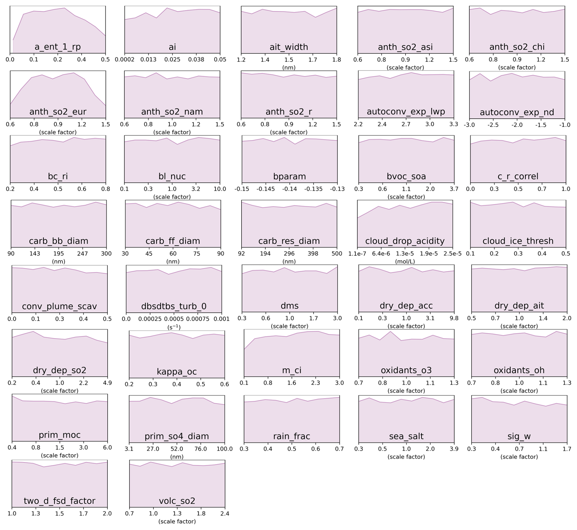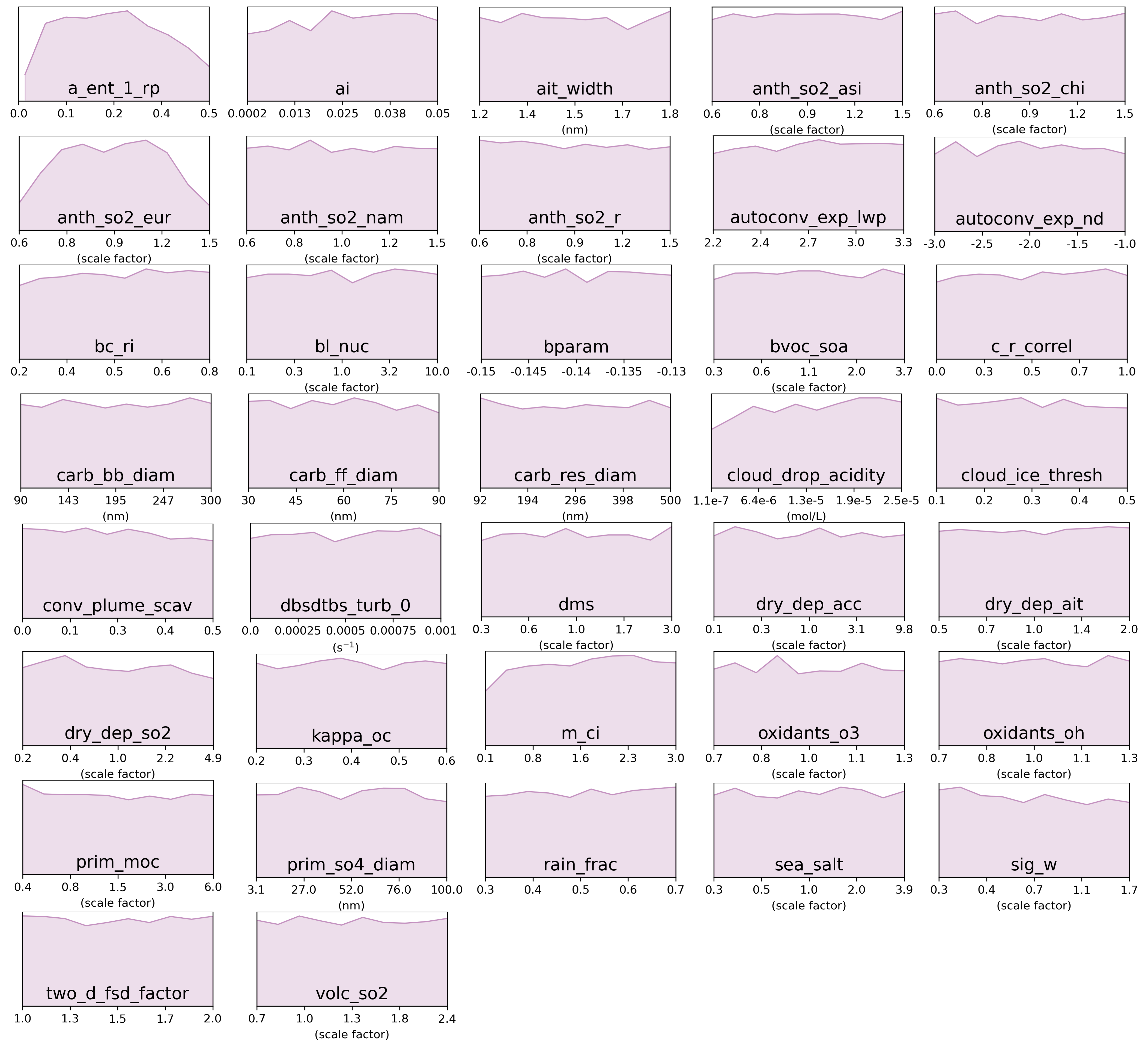 Figure C1Marginal PDFs for all 37 parameters after constraint towards sulfate concentrations observations in the pink cluster (Western Europe).