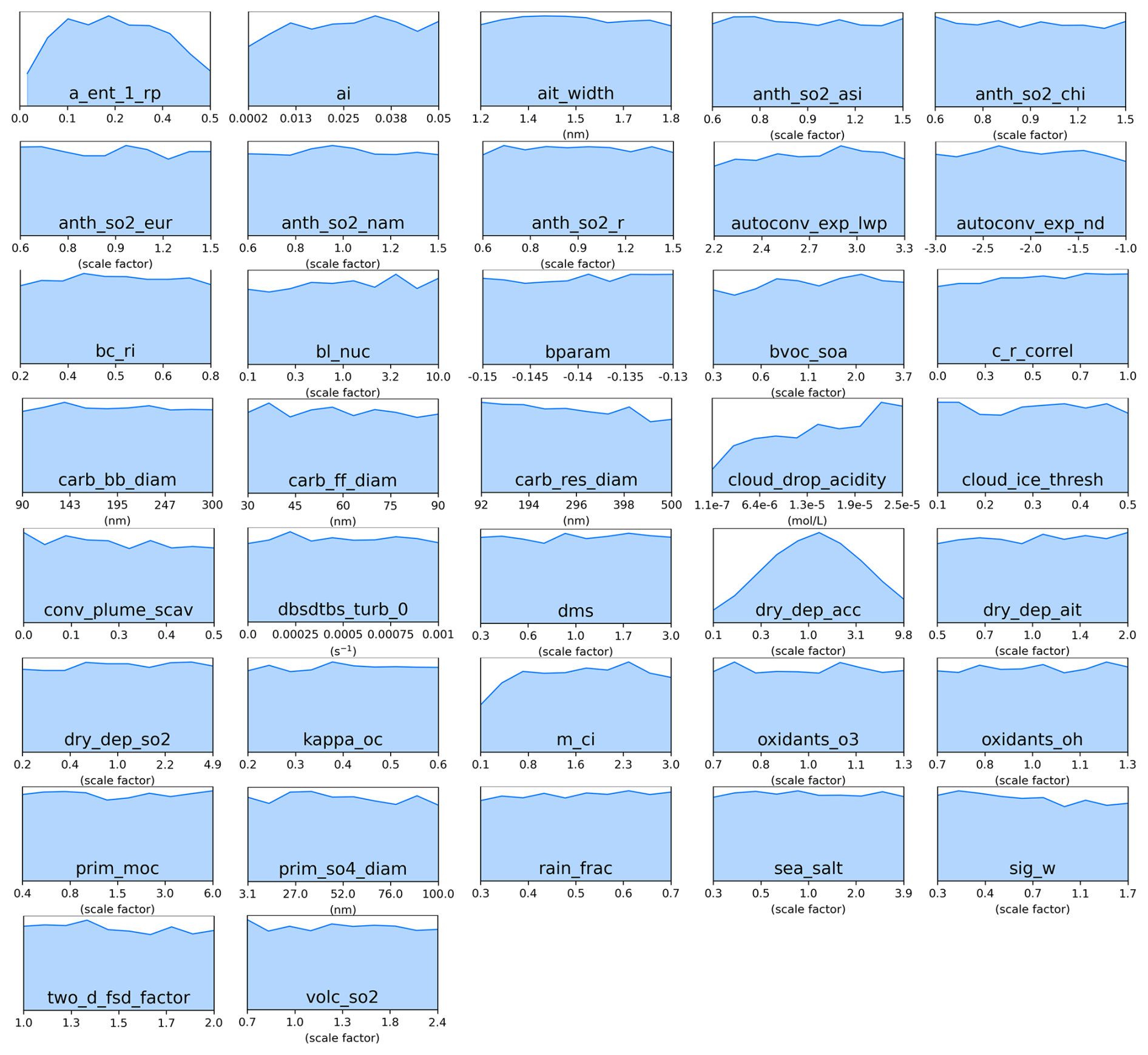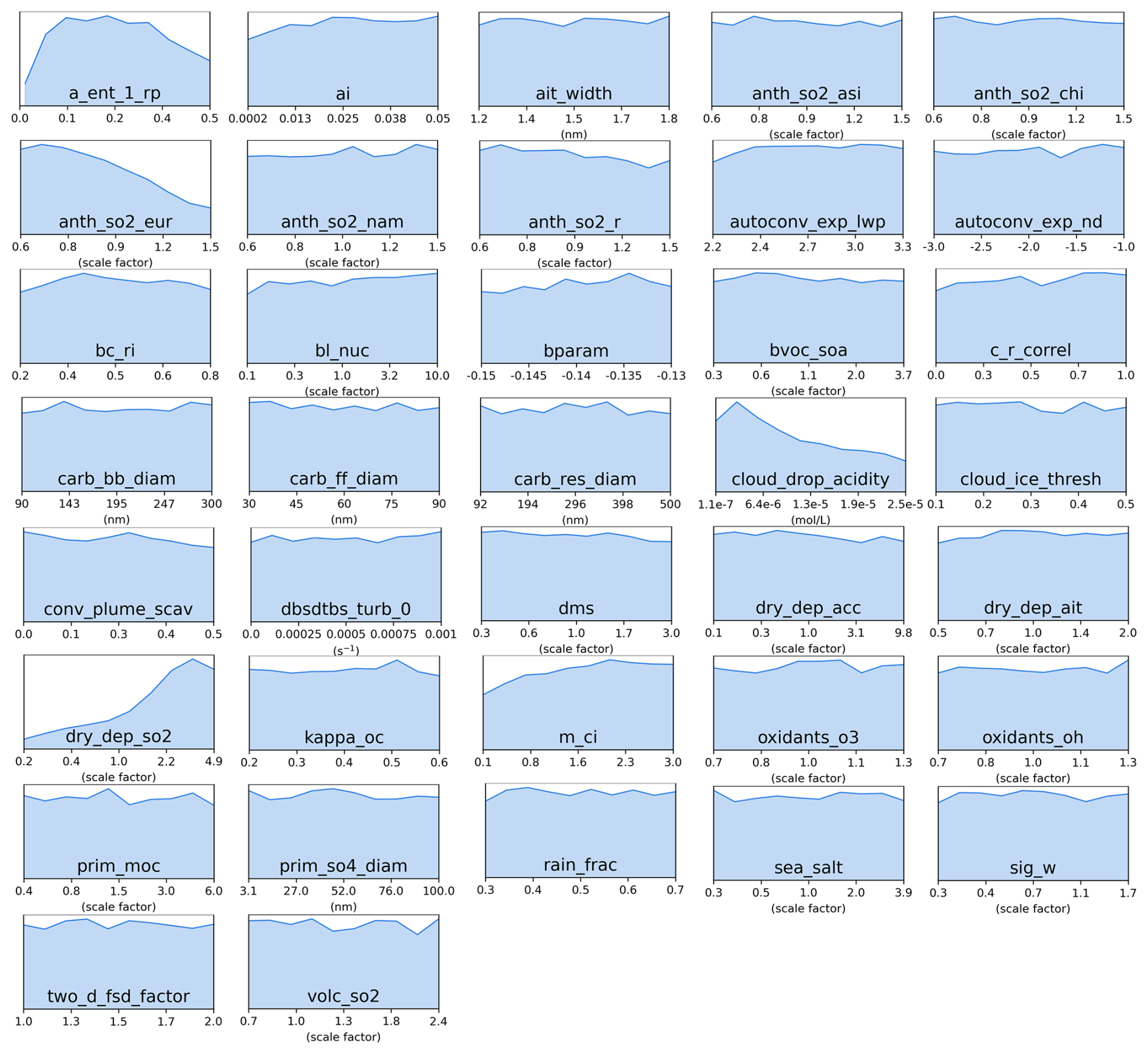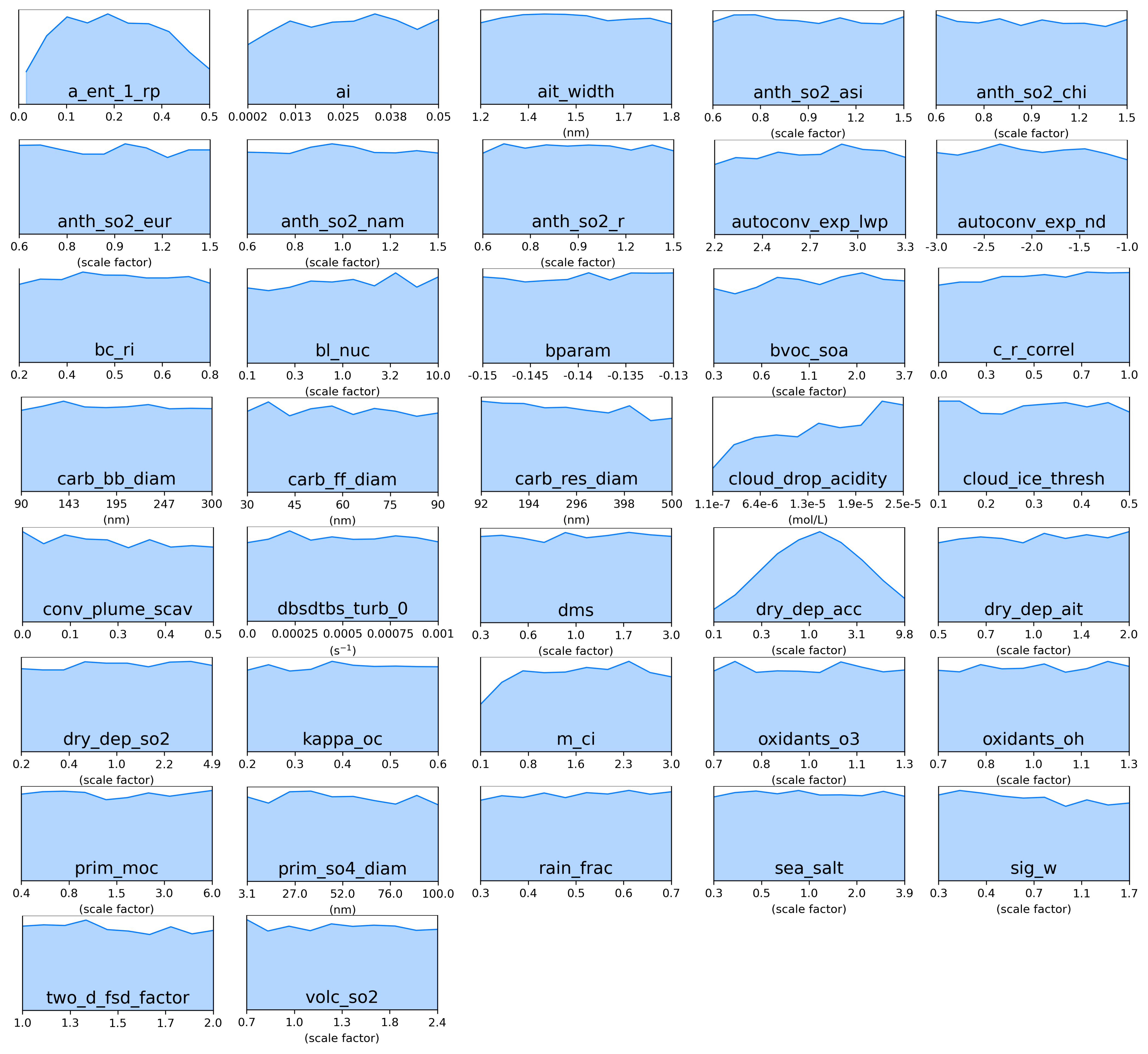 Figure C2Marginal PDFs for all 37 parameters after constraint towards sulfate concentrations observations in the blue cluster (Northern Europe).