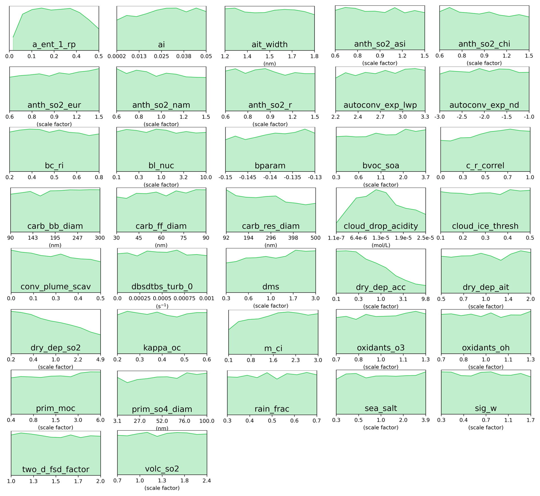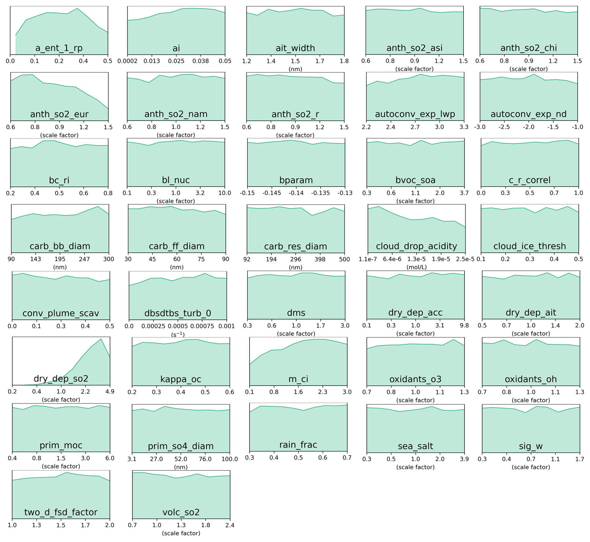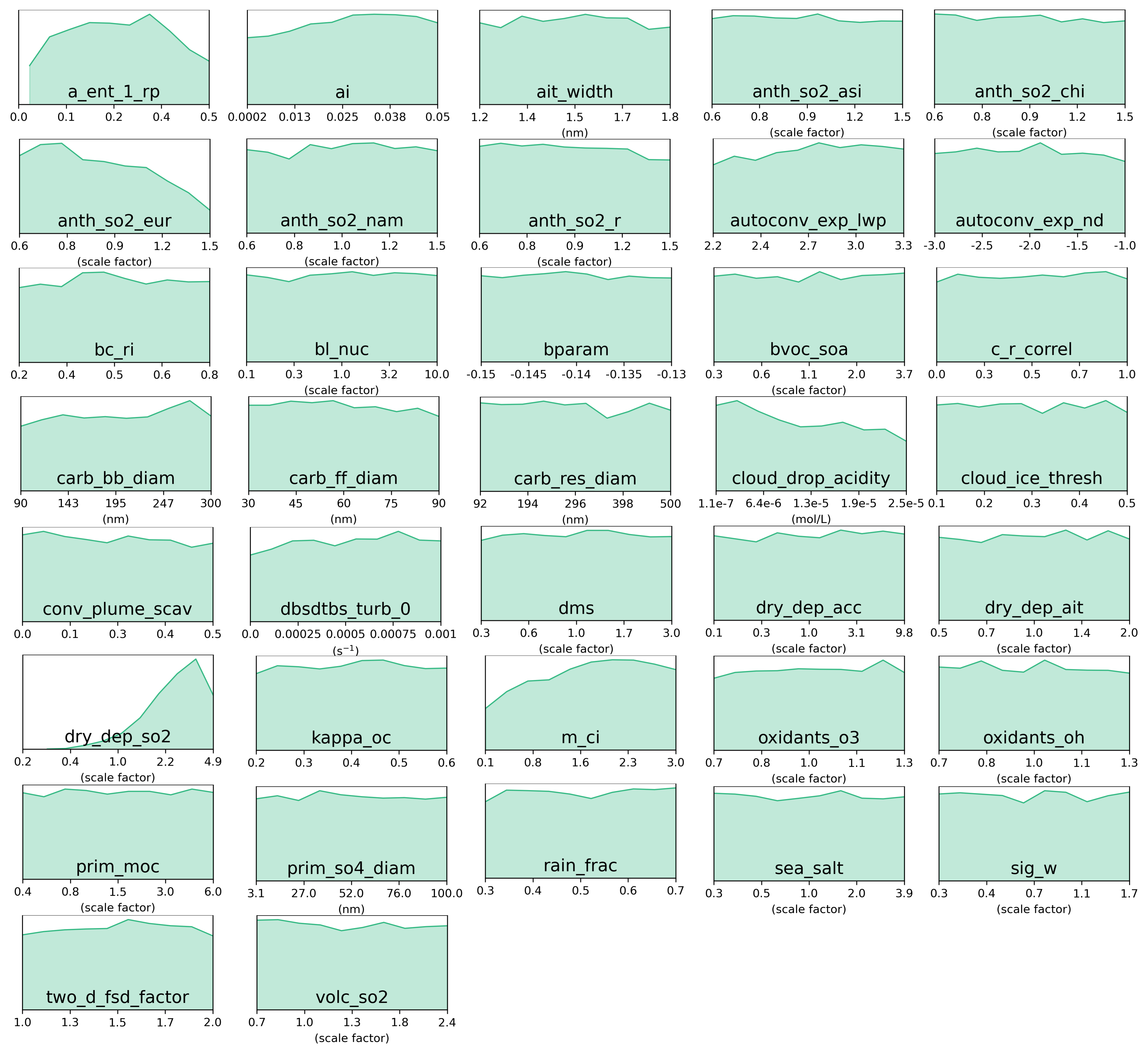 Figure C6Marginal PDFs for all 37 parameters after compromise between AOD and sulfate concentration constraints in the green cluster. The compromise consists of 298 common model variants after weakening constraint to individual clusters to 21 000 model variants each.