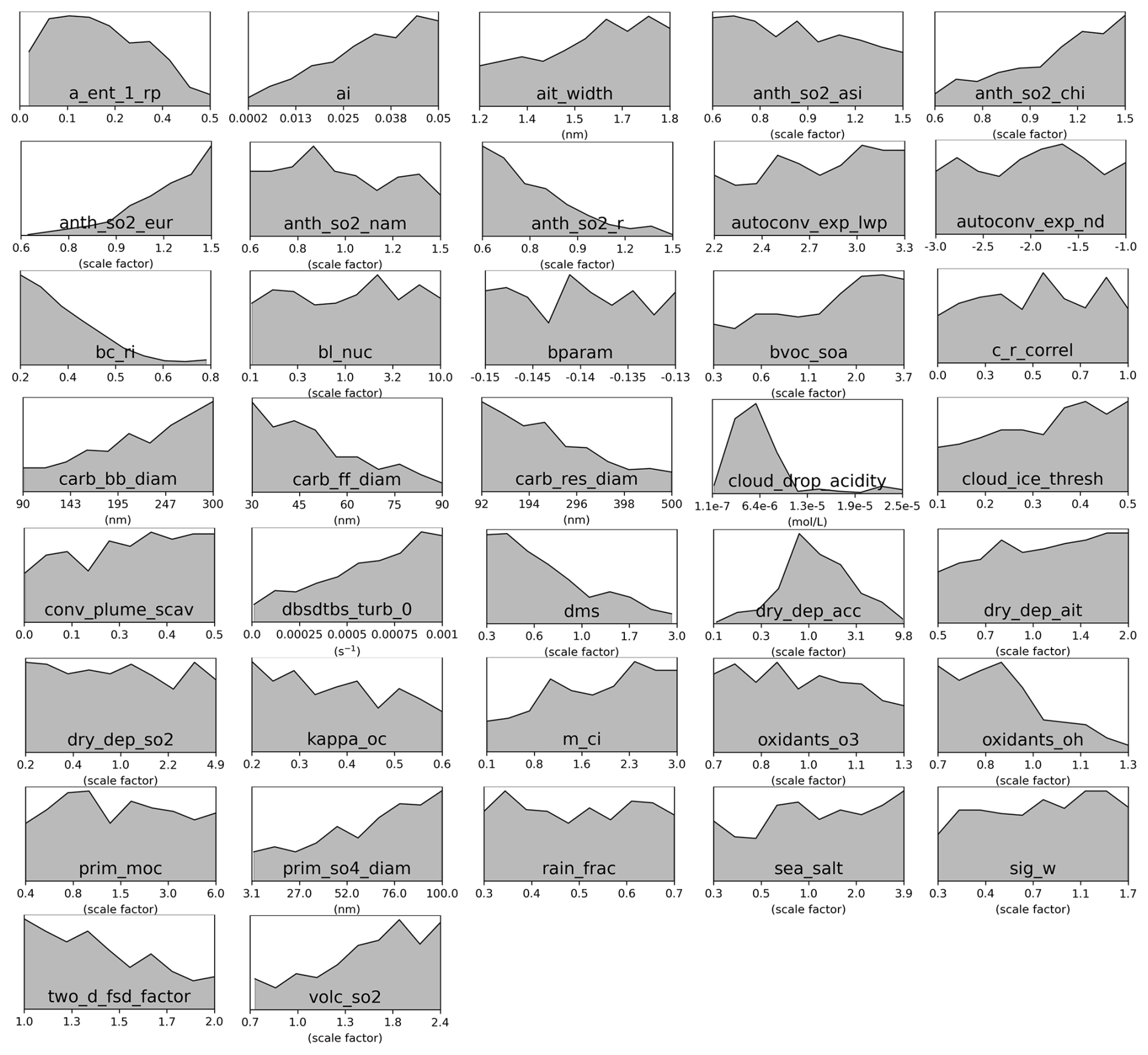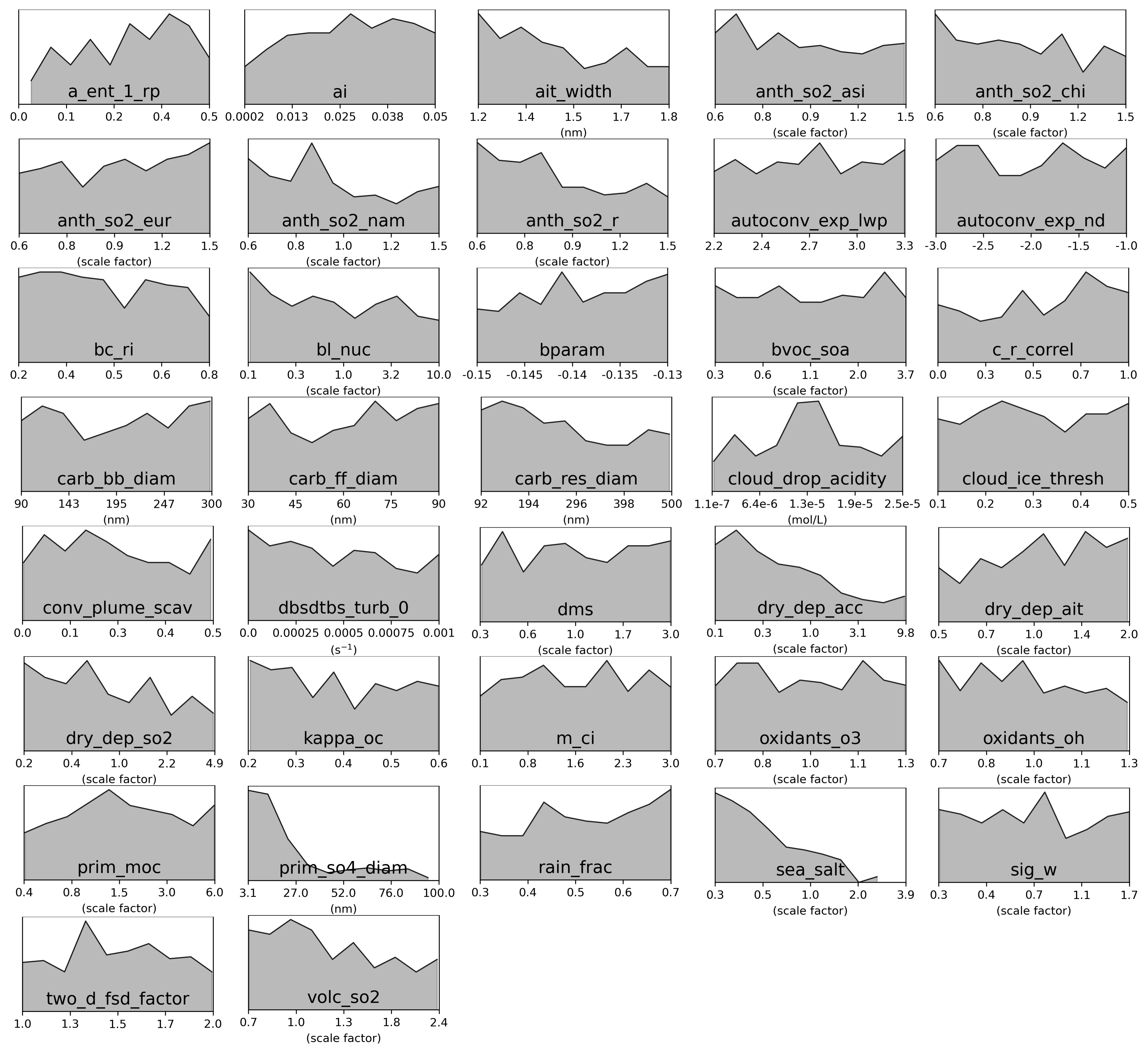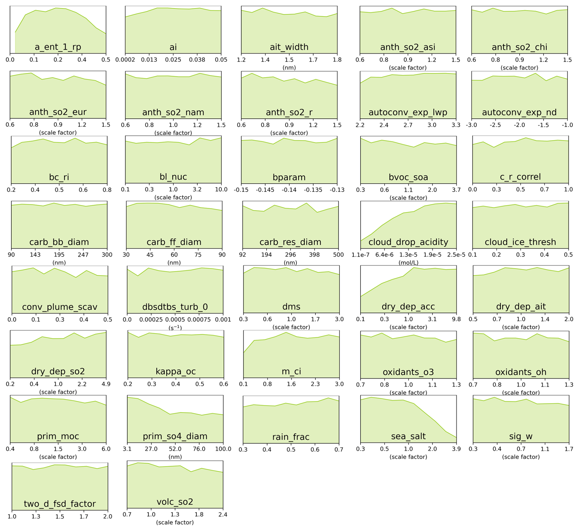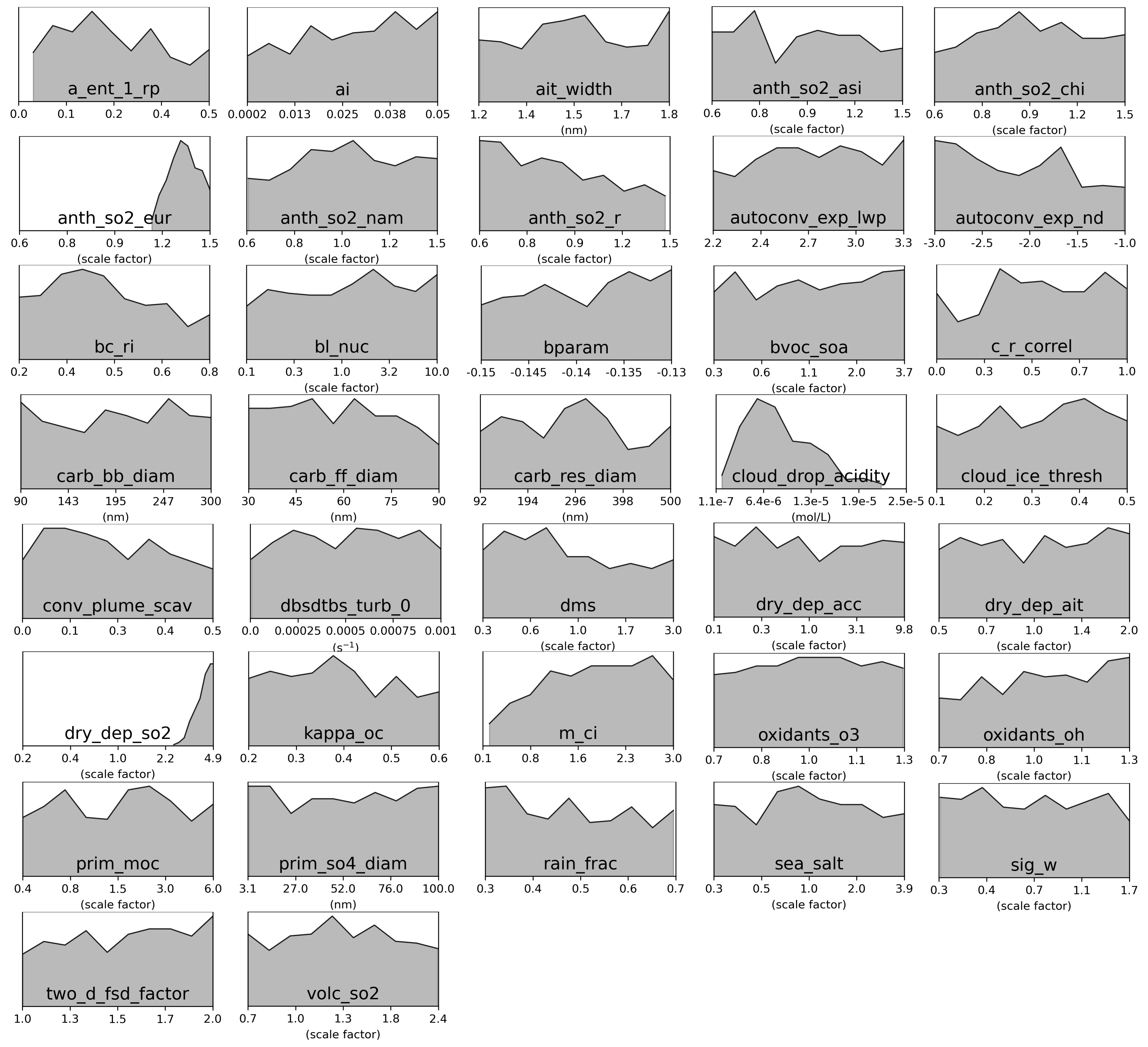 Figure C6Marginal PDFs for all 37 parameters after compromise between AOD and sulfate concentration constraints in the green cluster. The compromise consists of 298 common model variants after weakening constraint to individual clusters to 21 000 model variants each.