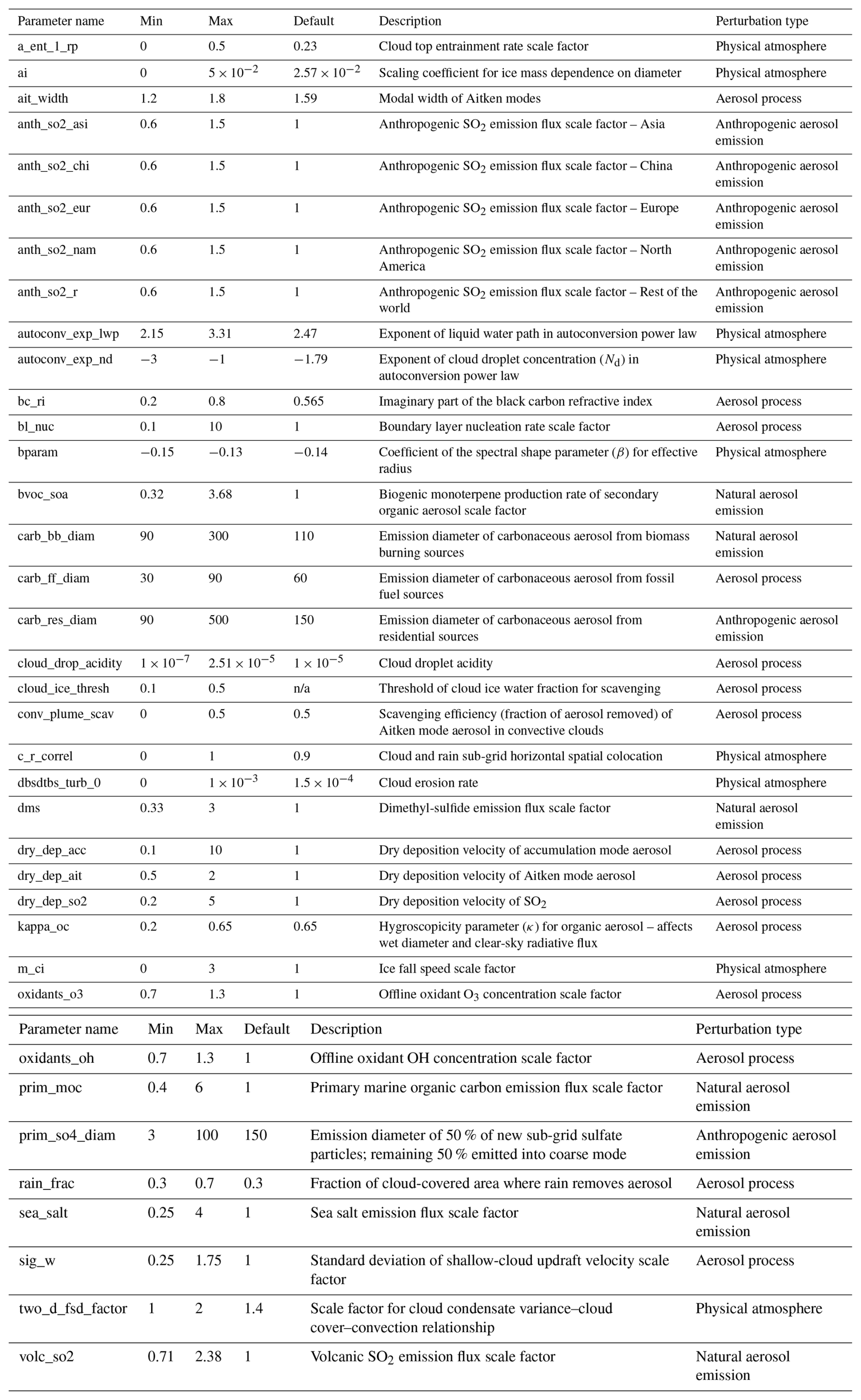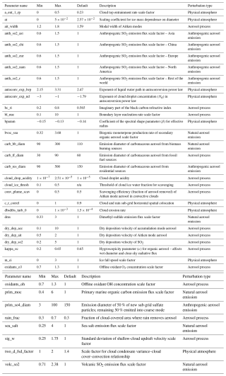 The PPE from Regayre et al. (2023) consists of 221 model simulations, with 37 perturbed parameters related to aerosols, clouds, and the physical atmosphere (detailed in Table A1). The selection of the perturbed parameters was based on those identified in previous PPEs as large causes of uncertainty in key outputs (Regayre et al., 2015, 2018; Sexton et al., 2021; Yoshioka et al., 2019), together with parameters associated with structural model developments (Mulcahy et al., 2018, 2020; Walters et al., 2019). Their perturbation ranges were determined using formal expert elicitation using the Sheffield Elicitation Framework (SHELF) approach described in Gosling (2018). The PPE was developed in two stages. In the first stage, the most implausible parts of the parameter space were identified and removed by comparing simulated shortwave fluxes with observations using a history-matching style approach. The second stage PPE was sampled from the remaining, more plausible parameter space and forms the focus of this analysis.