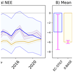 The core ecosystem-level meteorological and NEE data was collected between 2001 and 2020 at 294 globally distributed eddy-covariance (EC) towers (see appendix for a full list of sites). These data were then processed using the ONEFLUX processing pipeline (Pastorello et al., 2020). Variables from the eddy-covariance sites are air temperature, vapor pressure deficit, incoming shortwave radiation, the computed potential shortwave incoming radiation, and the computed wind speed.