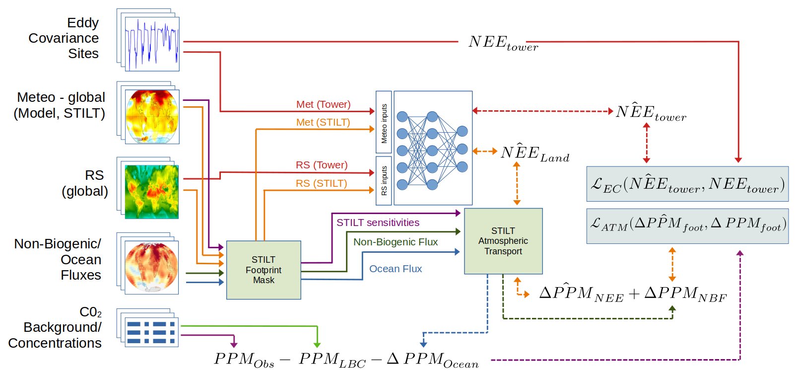 To address these limitations, we create a new model that uses a hybrid combination of direct observations and atmospheric dynamics to integrate ecosystem-level eddy-covariance data and atmospheric CO2 mole fraction data into a single coherent ecosystem-level flux model. To create the computational link between ecosystem-level fluxes and atmospheric CO2 mole fraction we use a physical atmospheric transport model, the Stochastic Time-Inverted Lagrangian Transport (STILT) model (Lin et al., 2003). In this way, both eddy-covariance and atmospheric observations are used to train and update the model at the ecosystem level, the result is a bottom-up model that uses atmospheric data to improve the representation of the land surface. This technique opens a large corpus of new observations for constraining the model. Due to varying transport patterns around each tower, the data-driven model is exposed to a large number of non-eddy-covariance locations which represent biophysical conditions that are coupled to important dynamics in global NEE. This enrichment of the model's view of the underlying relation between driver variables and NEE, we hypothesize, allows the system to learn additional dynamics in global, and regional NEE.