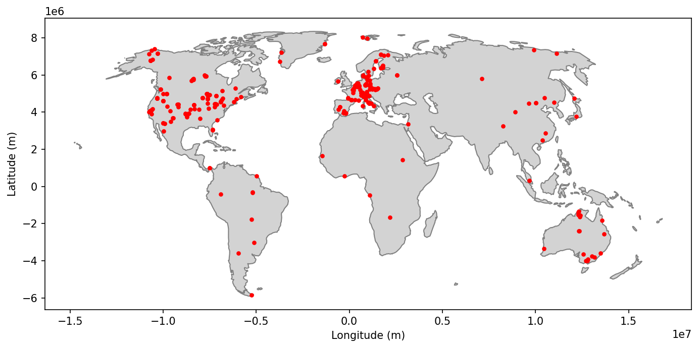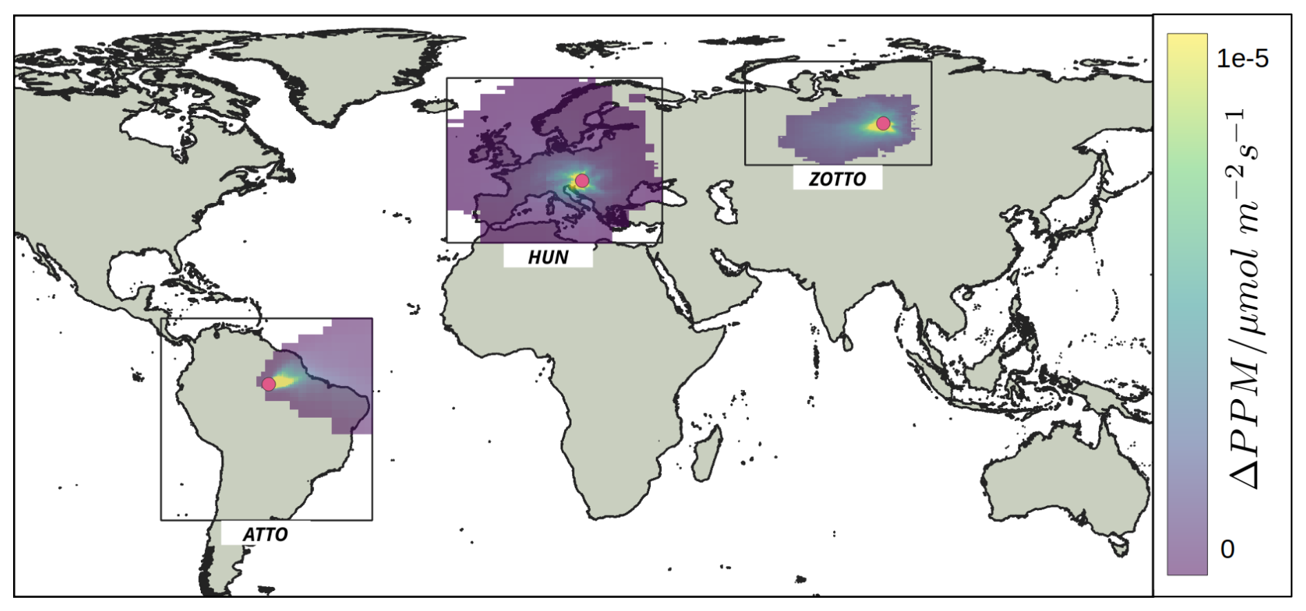 The model in this study uses observations of atmospheric CO2 mole fraction from tall-tower observatories measured at three sites: ATTO (Botia et al., 2022), Hegyhatsal (Haszpra, 2024) and Zottino (Tran et al., 2024a). These sites are chosen to include one tropical, one extra-tropical and one boreal domain. The mole fraction data used for the Amazon Tall Tower Observatory in Brazil (ATTO), collected at 79 m are the same used and fully described in Botia et al. (2022). Mole fraction data for the Hegyhátsál tower in Hungary (HUN), collected at 115 m are provided by the Integrated Carbon Observation System (ICOS). The observations for the Zotino Tall Tower Observatory in Siberia (ZOTTO), collected at 301 m are provided by Tran et al. (2024b). The data for all three towers was provided hourly, for one calendar year (2019 for ZOTTO and Hegyhátsál, 2015 for ATTO). Only daytime observations from 13:00–17:00 (local time) were used. The selected times represent a daytime planetary boundary layer (PBL) with assumed well-mixed convective conditions (Peters et al., 2010).