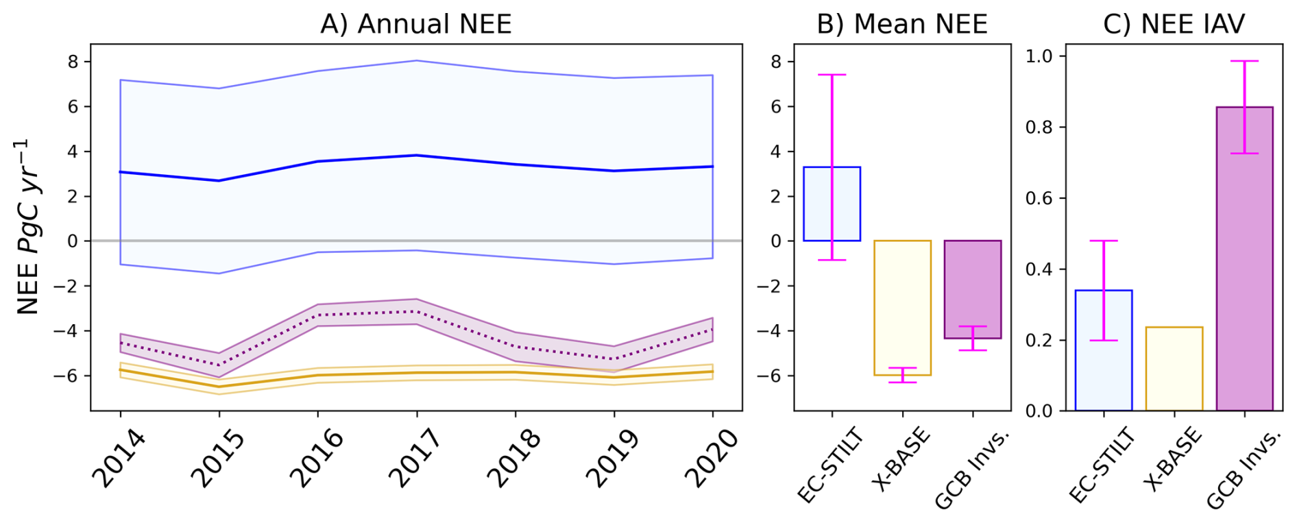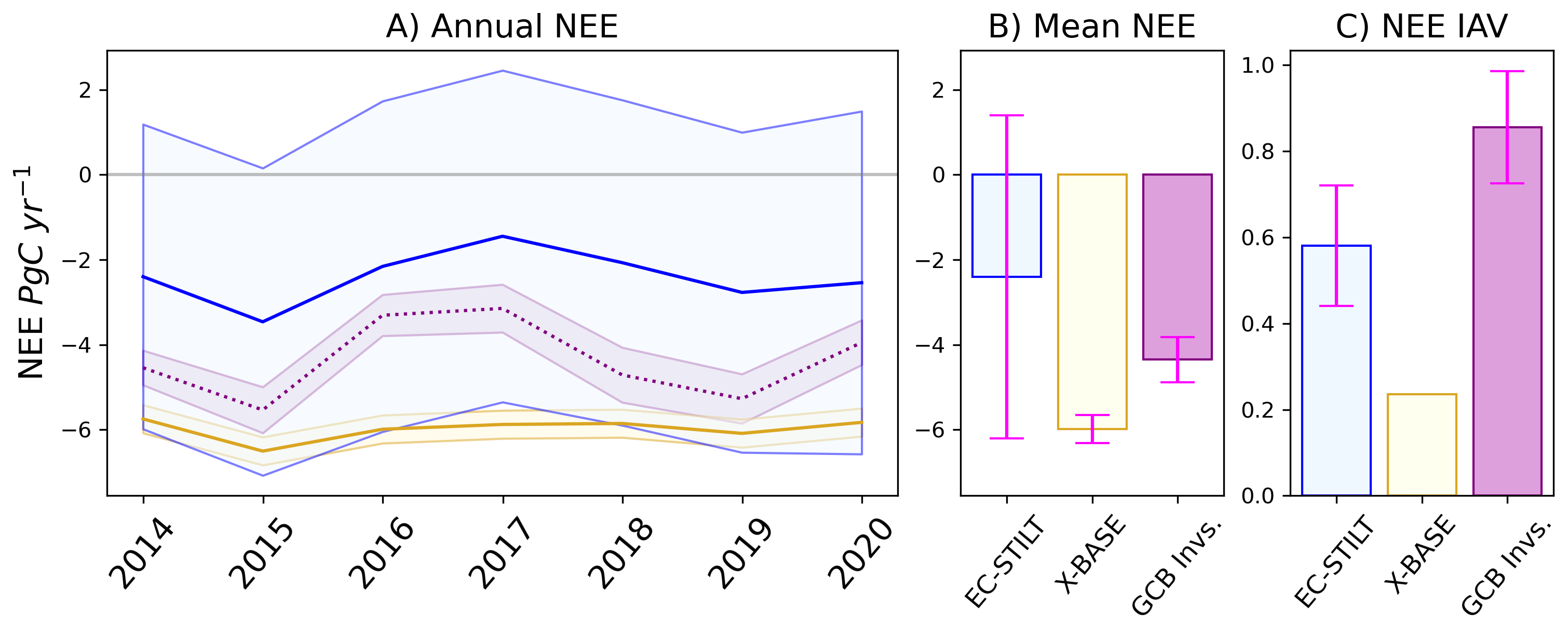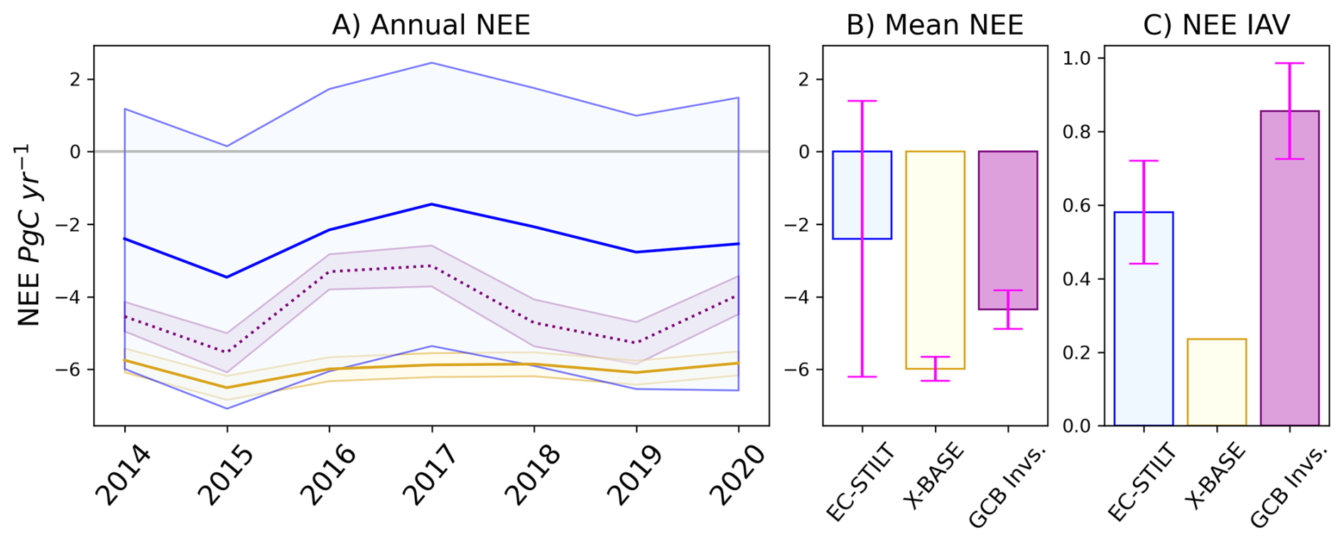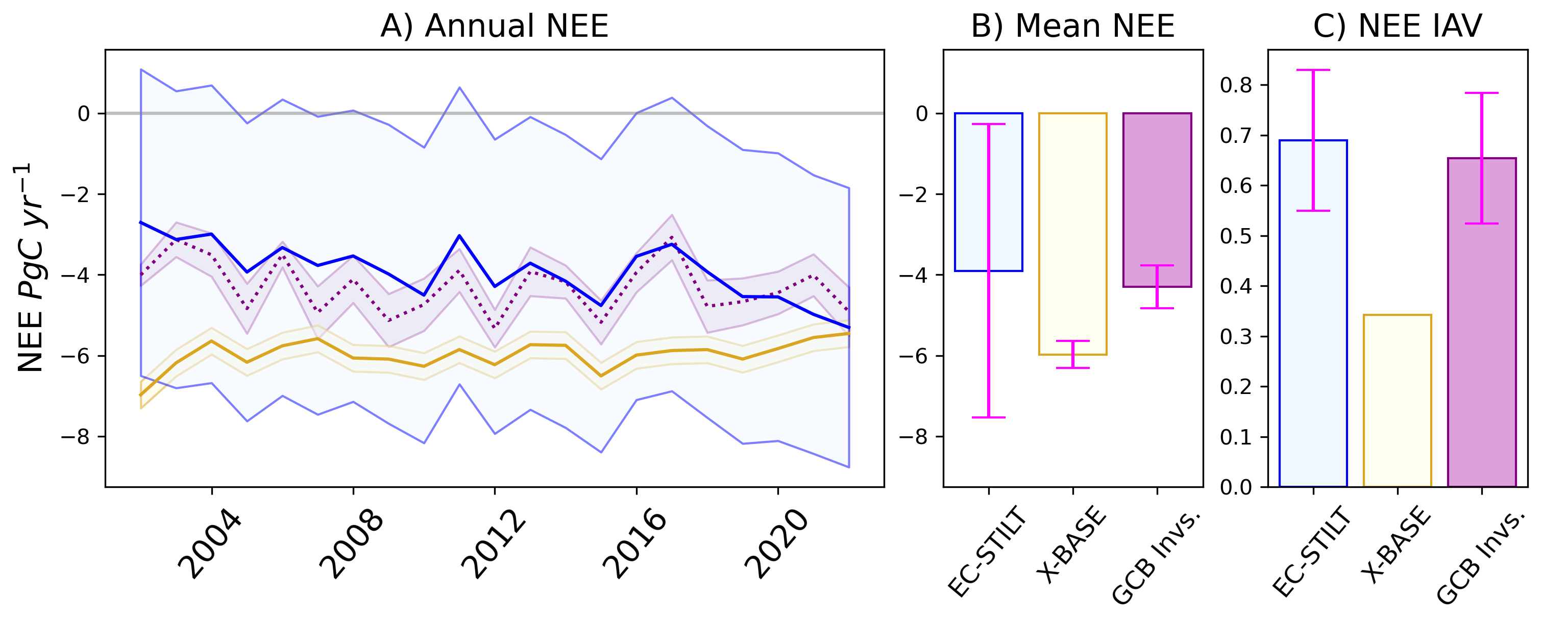 Figure 3(A) Annual NEE integrated globally in Pg C yr−1. The blue line is the mean of the EC-STILT ensemble with the shaded area representing the 1σ range across ensemble members. The yellow line is FLUXCOM X-BASE. The purple dotted line is the mean of the GCB23 ensemble of atmospheric inversions, and the shaded area is the standard deviation across the ensemble members. (B) Mean NEE integrated globally over all years. The error bars represent the 1σ range across ensemble members or published uncertainty. (C) IAV of NEE, calculated as the standard deviation of the global integral. The error bars represent the 1σ range of IAV across ensemble members.