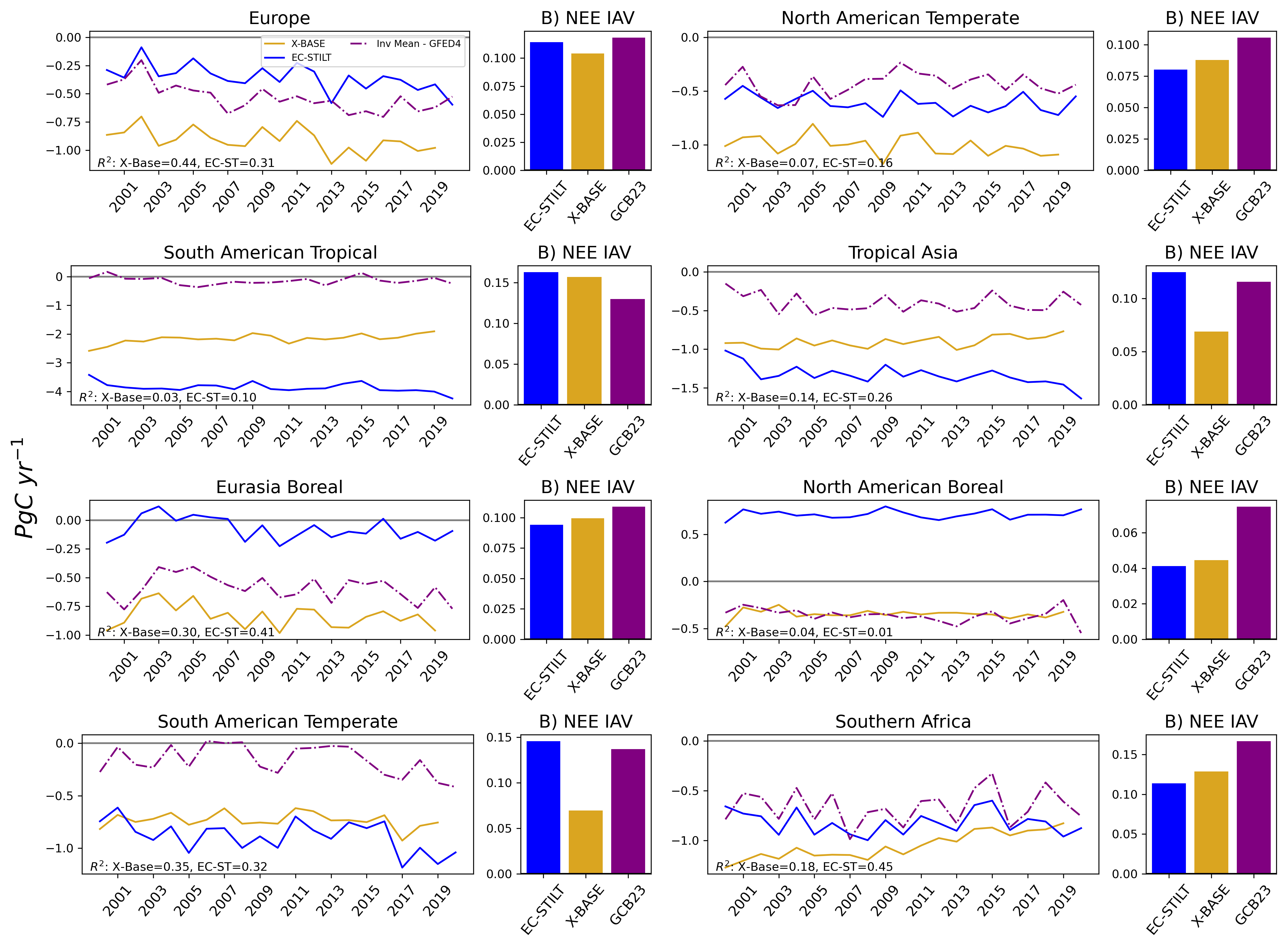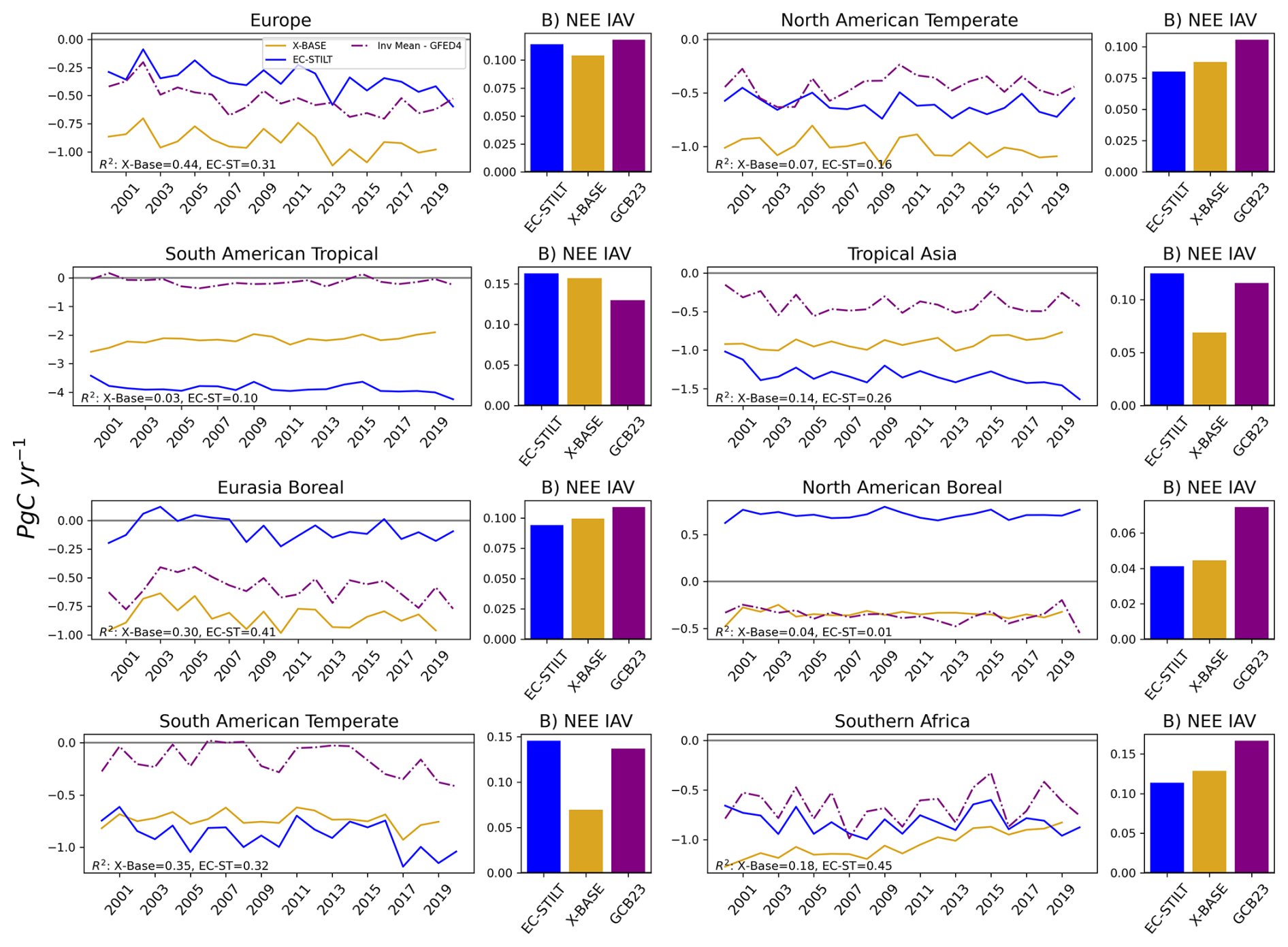 The atmospheric constraint has a strong impact on the EC-STILT estimate of regional fluxes. Similar to the global results, EC-STILT estimates regional magnitudes of NEE which are largely inconsistent (Fig. 5, Table 2) when compared with the ensemble of atmospheric inversions used in Friedlingstein et al. (2023) corrected for fire using GFED4.1 fire emissions (Fig. 5, purple lines). The regional IAV is more in agreement with atmospheric inversions, producing similar or better R2 and magnitude when compared with X-BASE regional NEE (Fig. 5, inset text, Table 2).