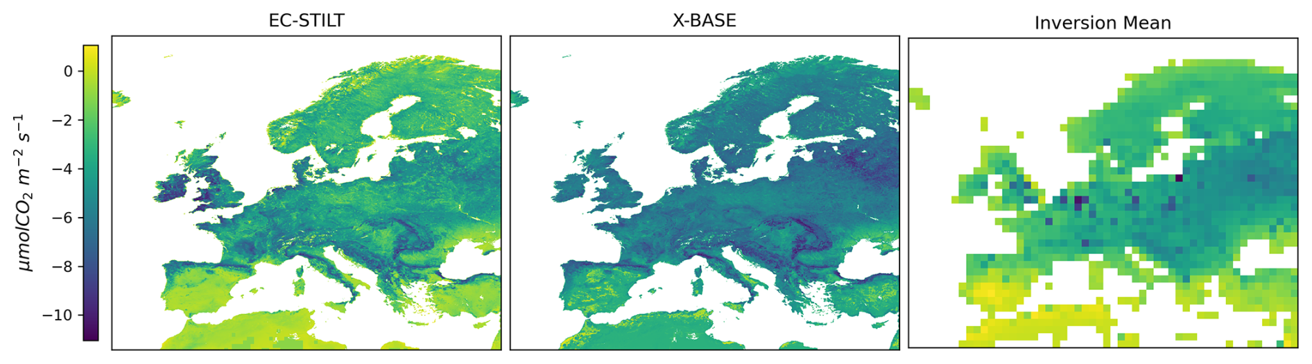 Figure 6Mean summer NEE (JJA) in for EC-STILT, X-BASE, and the ensemble mean of the atmospheric inversions.