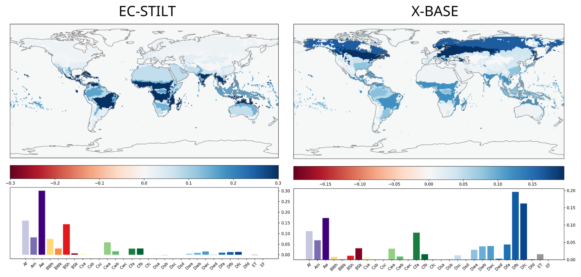 Figure 7Attribution of IAV by Koppen-Geiger land cover class. The figure on the left is EC-STILT, the figure on right is X-BASE. The value represents the relative contribution of the region to the overall global IAV. The attribution is calculated by the covariance method described in (Lee et al., 2023) using annual detrended NEE anomalies.