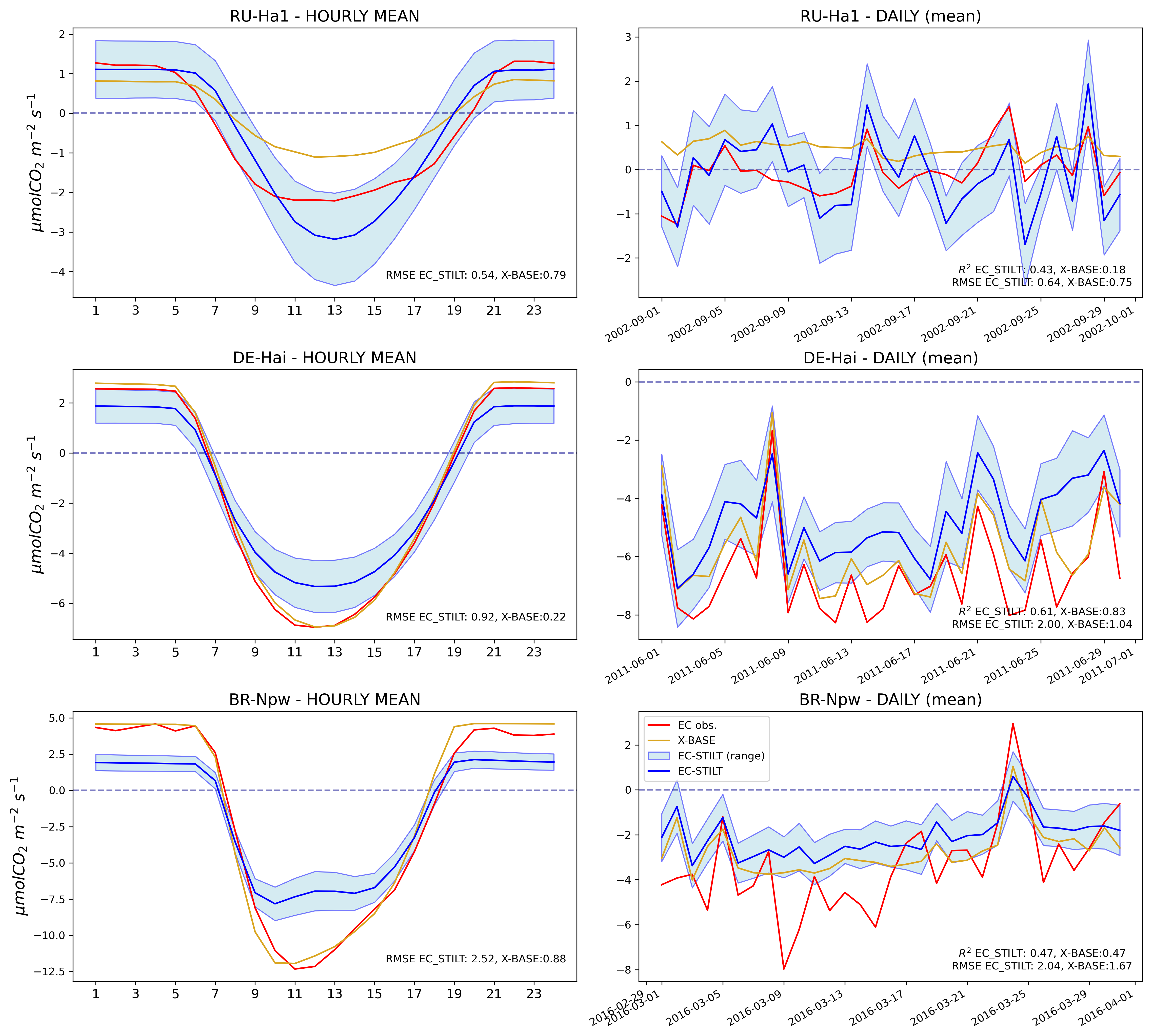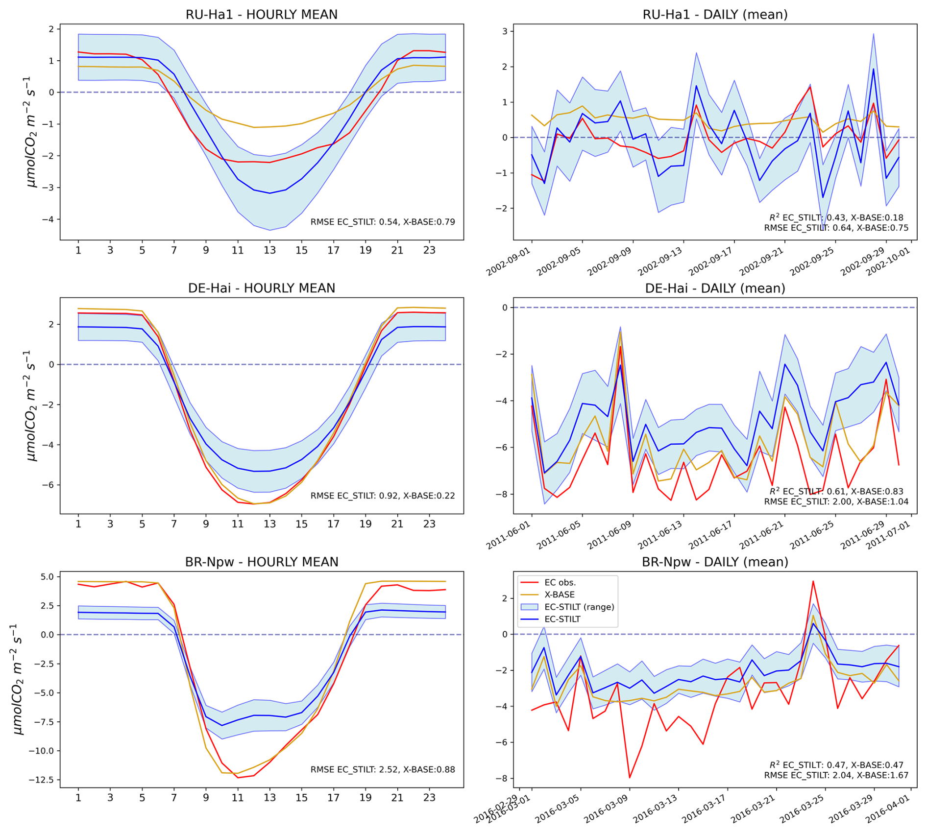 As with regional results, the site-level performance of EC-STILT appears to be strongly influenced by the level of local constraint from eddy-covariance. Figure 8 shows the hourly and daily averaged time series of NEE for three EC sites directly impacted by the atmospheric domains, one in boreal Russia (RU-Ha1), one in a German mixed forest (DE-Hai), and one Brazilian site in the Amazon basin (BR-Sa1). In the Russian site, EC-STILT (blue line) slightly improves the estimate of the mean daily cycle of the EC observations (red line) compared with X-BASE (RMSE of 0.54 compared with 0.79). When averaged to the daily scale, both EC-STILT and X-BASE produce a similar RMSE compared with the observations. EC-STILT appears to better represent the daily signal than X-BASE with a higher R2 (0.43 compared with 0.18). EC-STILT produces a range in NEE which is slightly larger than the EC record and much greater than FLUXCOM X-BASE (yellow line). Boreal regions are only moderately constrained in EC-STILT by eddy-covariance given the large difference in annual NEE between EC-STILT and X-BASE (Fig. 5). This may allow for larger differences at the site level, as the boreal observations do not sufficiently weigh against the atmospheric information.