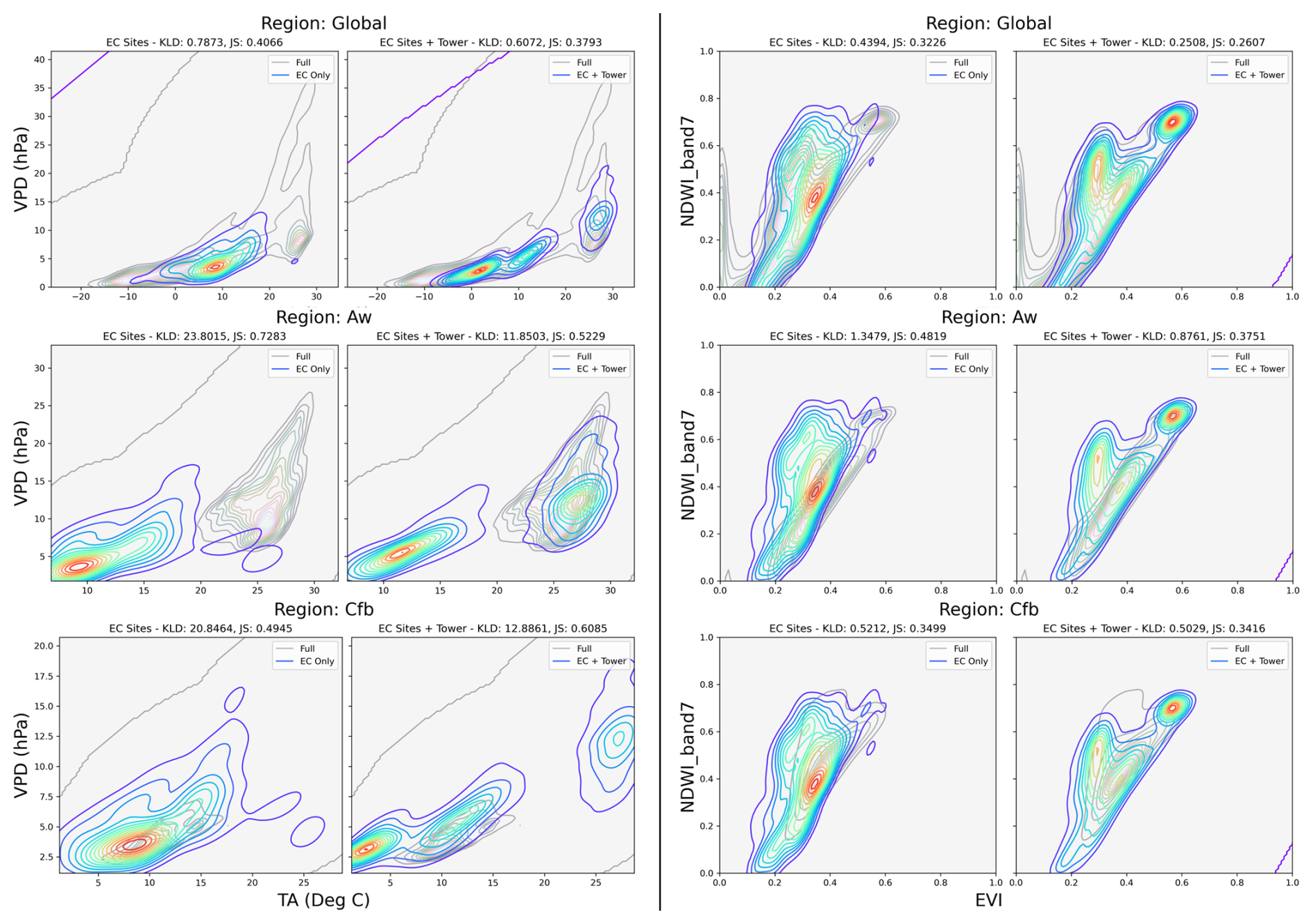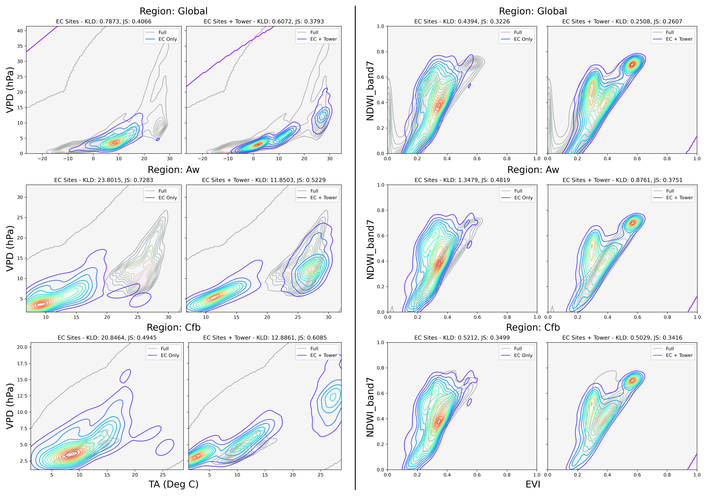 Figure 9Comparison between training set distributions in two multivariate spaces. Both columns show the difference in distribution between the EC-only training set (left), and the EC+Towers training set (right), and how they compare with the full distribution of the global or regional data in feature space. The left is TA and VPD, the right is EVI and NDWI. The top row is the full global set, the middle row is Köppen-Geiger class Aw (Tropical Dry Winter), the bottom row is Köppen-Geiger class Cfb (Temperate Oceanic). The contour lines represent the probability distribution function (PDF) of each distribution. Two metrics are calculated for each: Kullback-Leibler (KLD) and Jennsen-Shannon divergence (JS), which are measures of distance between the two PDFs.