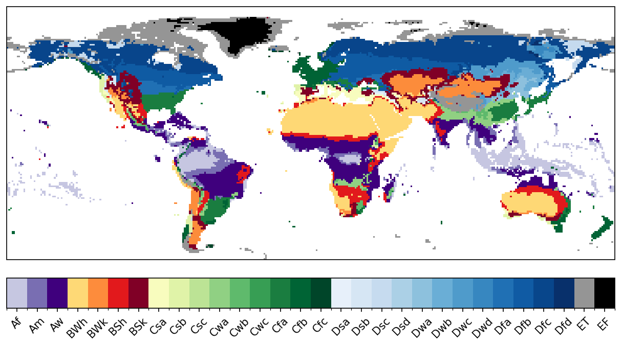 For regional analysis we use the set of 11 large regions from the TransCom 3 intercomparison project (TransCom) project (Baker et al., 2006). See Fig. A1 for the coverage and names of the 11 land regions used in this study. For analysis of model function by climate zone, we use the Köppen-Geiger (KG) classification system using maps from Beck et al. (2018), for the years 1991–2020. The Köppen-Geiger classification groups the land-surface into regions by their annual climate (Fig. A2).