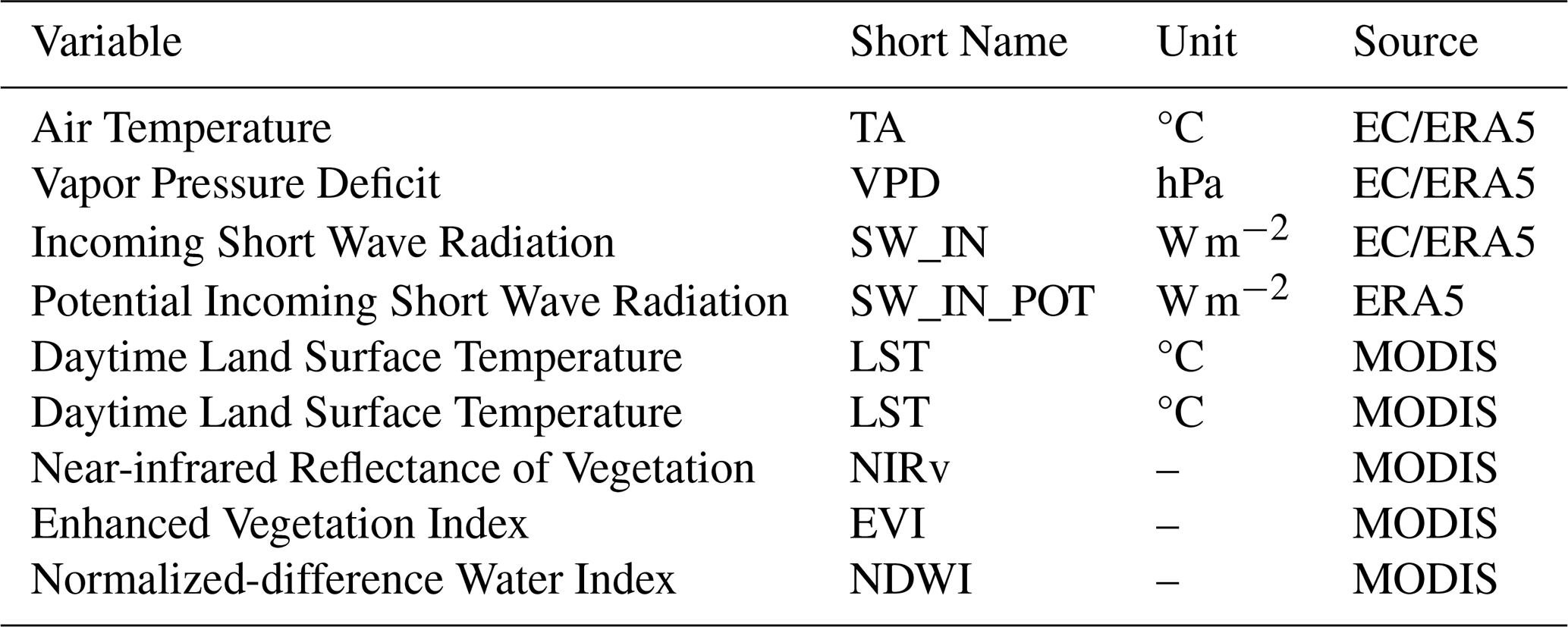 During training, at pixels co-located with eddy-covariance towers we use the surface reflectances (MCD43A4, Schaaf and Wang, 2015a) and land surface temperature (LST) from the MOderate Resolution Imaging Spectroradiometer (MODIS) collection v006 (http://daac.ornl.gov/MODIS/, last access: 11 January 2024). The surface reflectances are used to compute two vegetation indices, the enhanced vegetation index (EVI) (Huete et al., 2002), and the spectral reflectance of vegetation in the near-infrared (NIRv) (Badgley et al., 2019). A water index, the normalized difference water index (NDWI) with MODIS band 7 (Gao, 1996) was also included. MODIS data has a spatial resolution of 0.05°, and a 1 d temporal resolution. The full set of variables is described in Table 1.