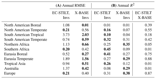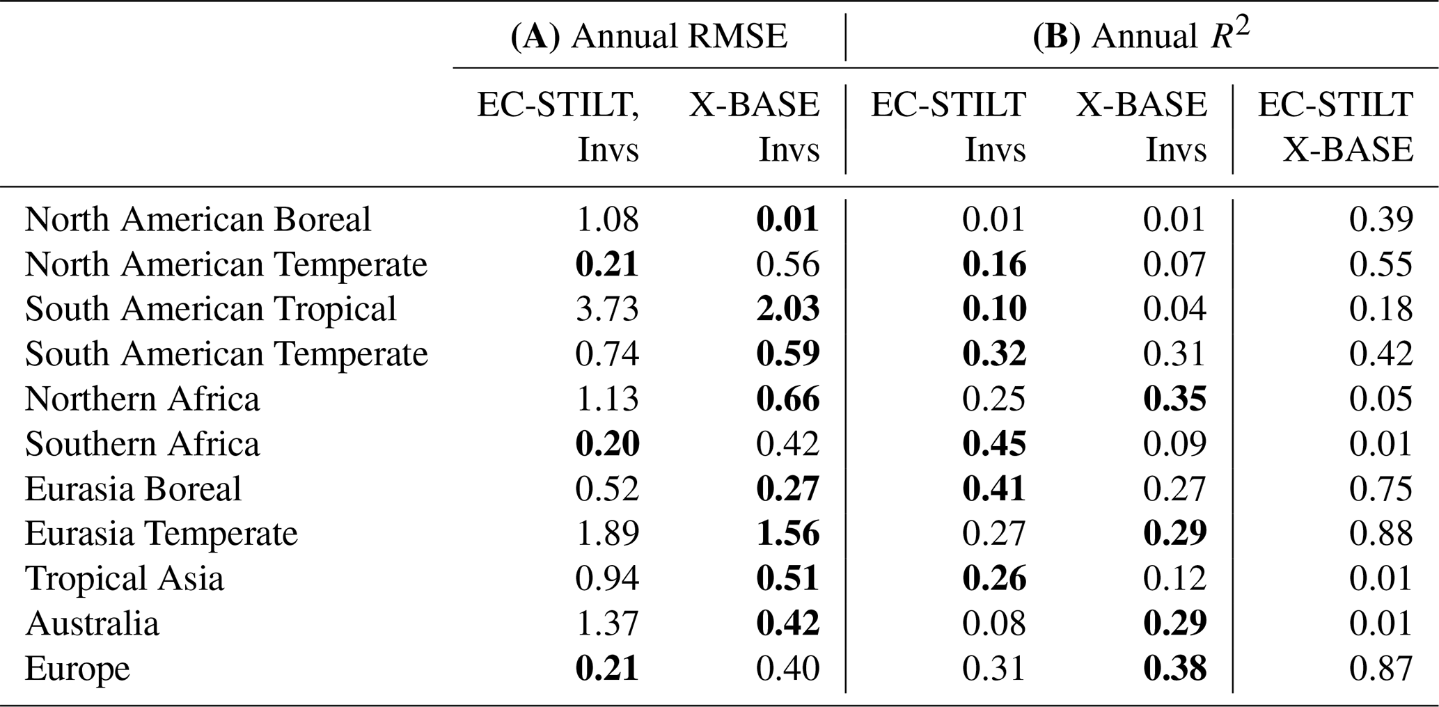 Table 2Comparison of different estimates with GCB: Column (A) shows the RMSE between the annual regional integrals in Pg C yr−1 of EC-STILT and X-BASE with the atmospheric inversion ensemble mean with fire removed (Invs). Column (B) shows the R2 between the annual regional integrals from EC-STILT and X-BASE with regard to the atmospheric inversion ensemble mean, and between EC-STILT and X-BASE. Bold indicates the higher relative performance between EC-STILT and X-BASE for each region and metric.