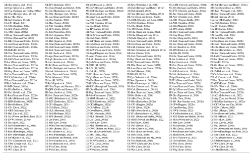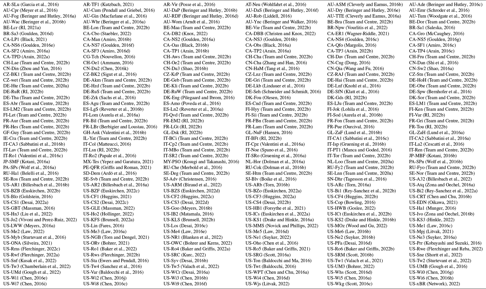 Team, W. W.. and Centre, I. E. T.: Warm Winter 2020 Ecosystem Eddy Covariance Flux Product for 73 Stations in FLUXNET-Archive Format – Release 2022-1, ICOS [data set], https://doi.org/10.18160/2g60-zhak (last access: 1 November 2022), 2022b. a, b, c, d, e, f, g, h, i, j, k, l, m, n, o, p, q, r, s, t, u, v, w, x, y, z, aa, ab, ac, ad, ae, af, ag, ah, ai, aj, ak, al, am, an, ao, ap, aq, ar, as, at, au, av, aw, ax, ay, az, ba, bb, bc, bd, be, bf, bg, bh, bi, bj, bk, bl