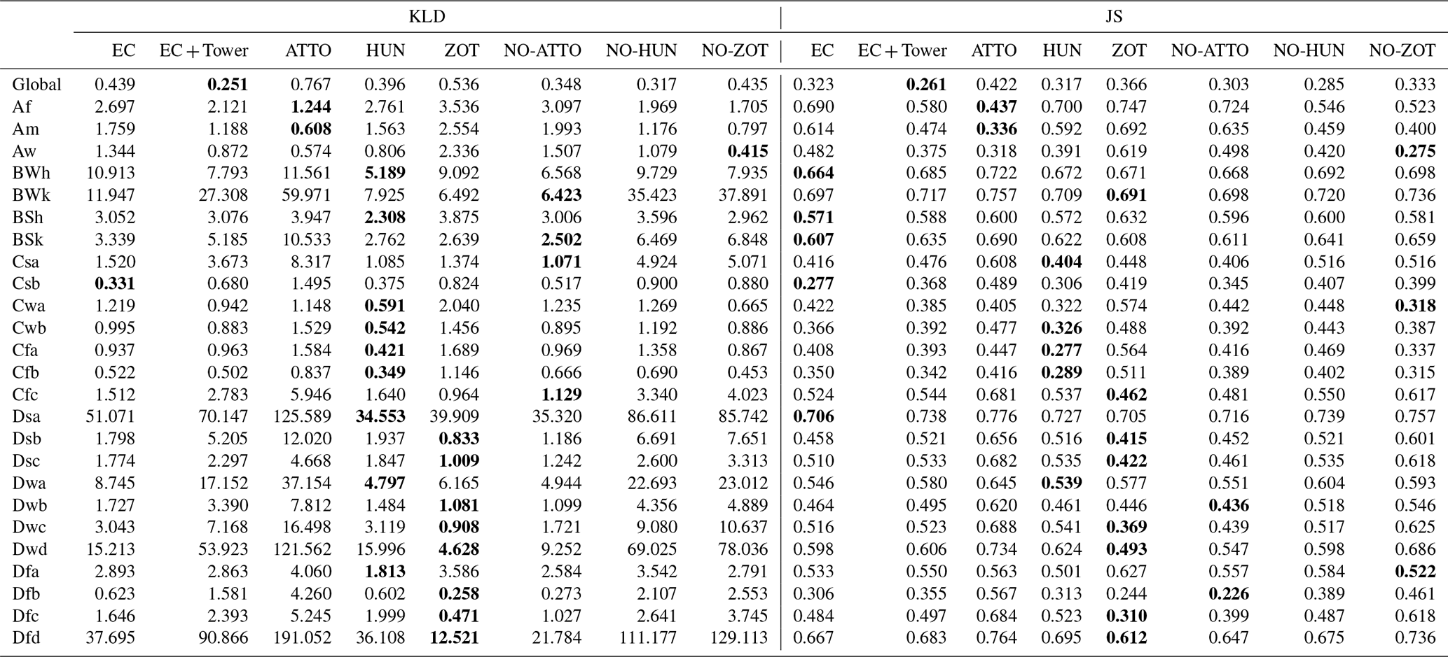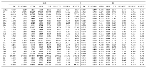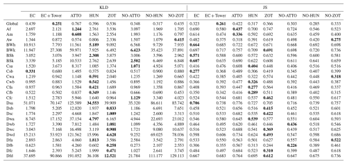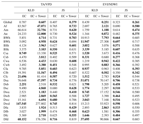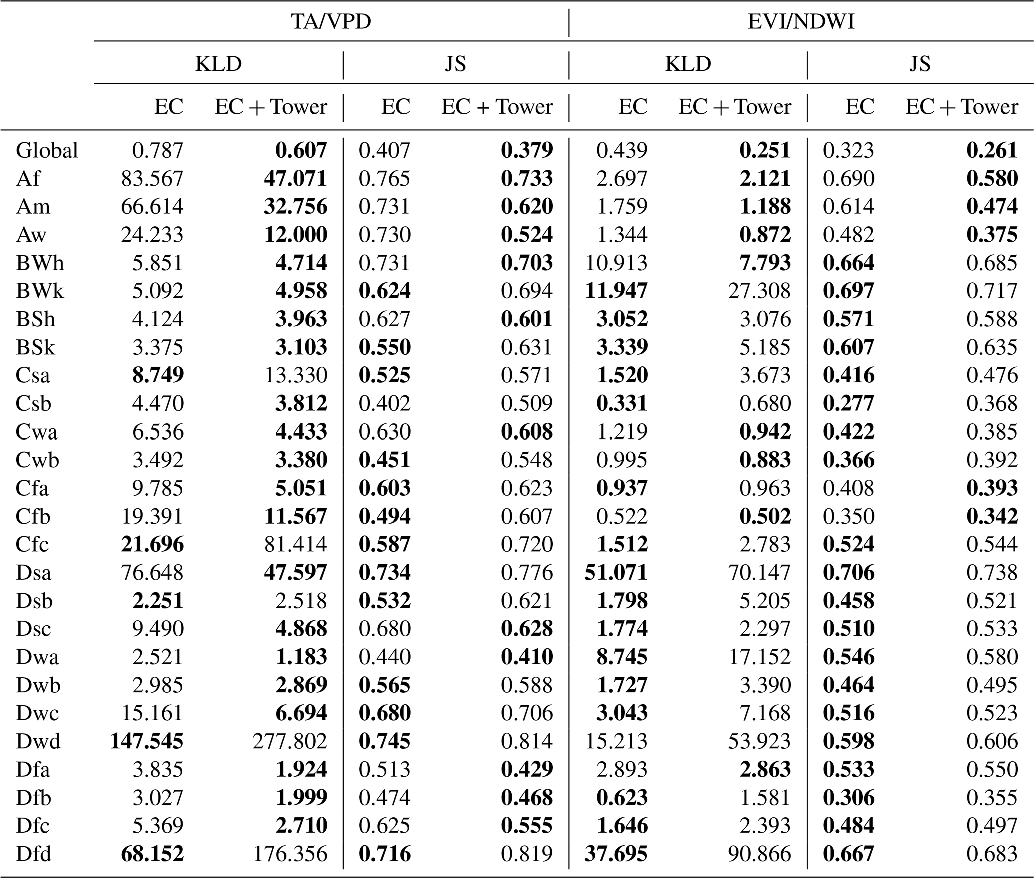 We analyse in Fig. 9 the coverage of the EC-only and EC-STILT training data in terms of climate and ecological space by approximating the PDF of the two joint distributions in feature-space (TA/VPD, and EVI/NDWI). We compare the relative difference in the Kullback-Leibler distance (KLD) and Jennsen-Shannon metric (JS) between the PDF of the full, or natural distribution of a random subset of all pixels, either globally or by KG class, and the two training sets (Fig. 9, Tables B1–B3). The two variable pairs were chosen to create easily interpretable visualizations. We use subsets of the full 10-dimensional distribution to save on computational costs.