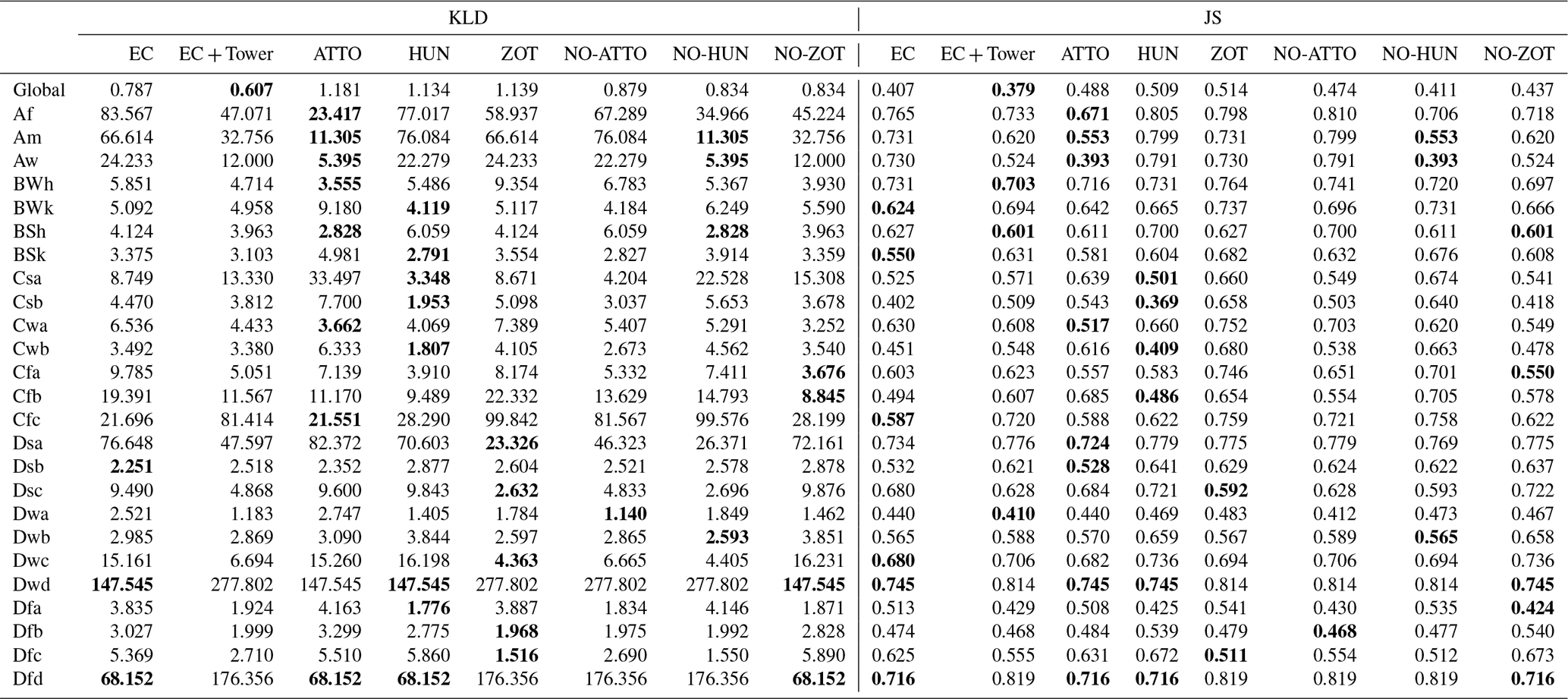The specific impact of individual towers, and their interactions in feature space, are inconsistent across regions, variable pairs, and metrics. In Tables B1 to B3, we expand the analysis by quantifying the effect of adding or removing individual atmospheric towers from training. The optimal distribution, shown in bold, characterized by the minimum distance between the two PDFs, is enriched by adding 1–3 towers in 49 of 52 regions across both distributions (Tables B1, B2). However when the full distribution from all towers are considered (Table B3), the improvement of the tower-enriched distributions is more modest, with only 9 of 26 regions (including global) having improved coverage by the towers in both variable pairs.