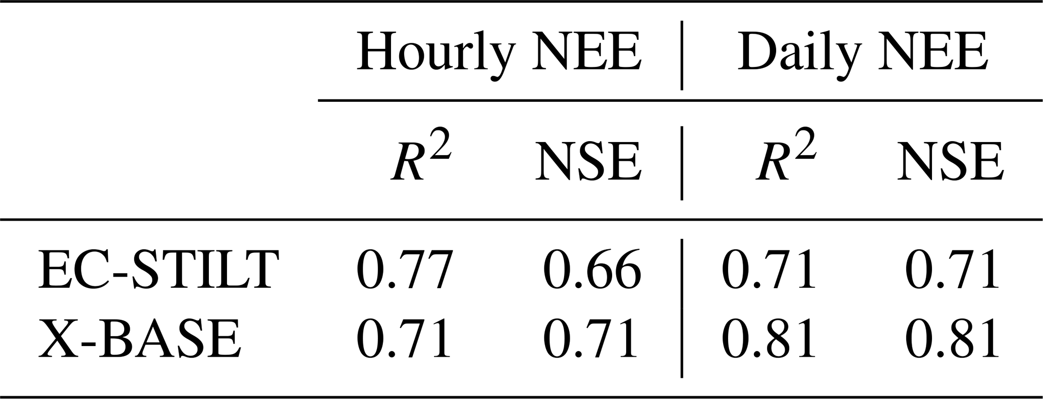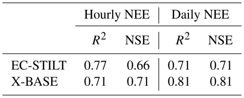 EC-STILT maintains good overall performance for NEE at the eddy-covariance site level, particularly at daily time scale. We use R2 and the Nash Sutcliffe model efficiency (NSE) (Nash and Sutcliffe, 1970) to evaluate model performance with regard to the observed eddy-covariance observations, and for comparison with X-BASE. In the EC-STILT's 10-fold cross-validation for all sites (Table B4), the model achieves a median NSE of 0.66, and median R2 of 0.77 for hourly fluxes (X-BASE: NSE 0.71, R2 0.71), and a median NSE of 0.76 and median R2 of 0.87 for diurnal mean NEE (X-BASE: NSE 0.81, R2 0.81), when comparing the observed and simulated time series. The data used for these performance metrics are the test data, held out from each cross-validation fold, and these tests are performed using the model member which did not see these data in training.