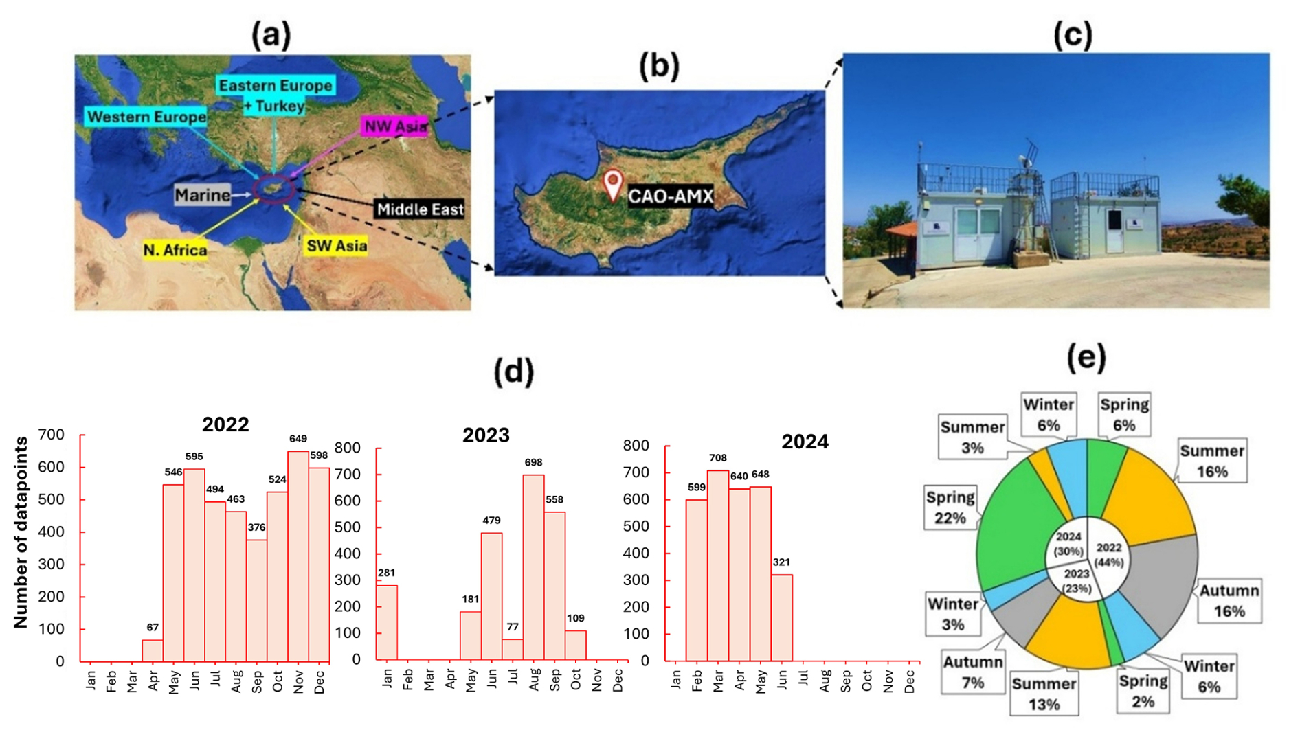 Figure 1Geographic context, air mass origins, and VOC measurement coverage at the CAO-AMX site (2022–2024). (a) Major regional air mass source areas influencing Cyprus; (b) location of the CAO-AMX in the Troodos Mountains; (c) the CAO-AMX monitoring station, a designated regional background site; (d) monthly distribution of number of datapoints for VOC measurements from April 2022 to June 2024; (e) summary of data coverage by season and year, showing overall representativeness of the dataset for multi-seasonal and multi-year analysis.