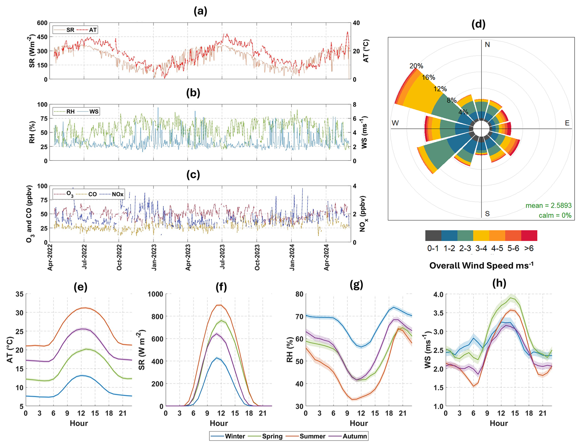 Figure 2Seasonal and diurnal variability of meteorological parameters and air pollutants in Cyprus. Panels (a)–(c) show time series (24 h rolling average) of (a) ambient temperature (AT) and solar radiation (SR), (b) relative humidity (RH) and wind speed (WS), and (c) gaseous pollutants, including ozone (O3), carbon monoxide (CO), and nitrogen dioxide (NO2) for study period. Panel (d) display wind rose diagrams indicating wind speed and direction for the entire study period. Panels (e)–(h) present the diurnal profiles of (e) ambient temperature (°C), (f) solar radiation (W m−2), (g) relative humidity (%), and (h) wind speed (m s−1) across the four seasons (spring, summer, autumn, winter). Shaded regions in panels (e)–(h) represent the standard error, capturing variability in diurnal cycles.