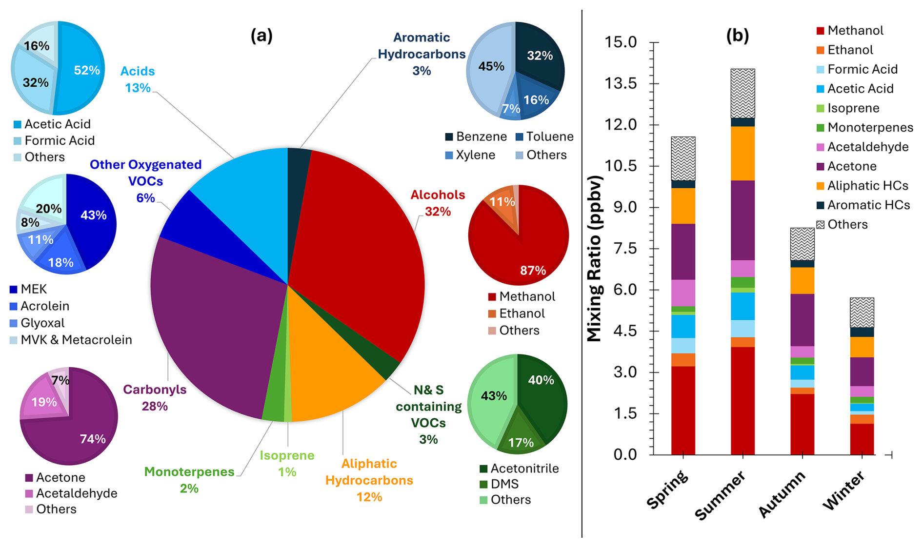 Figure 3Overview of VOCs in Cyprus: Composition and seasonal variability in its composition. (a) % contribution of different VOC groups in Cyprus, highlighting the dominance of alcohols (32 %), carbonyls (28 %), and acids (13 %). Subcategories within each VOC group are detailed in smaller pie charts. (b) Seasonal variability of the VOCs mixing ratio. Here carbonyls include aldehydes, and ketones. Overall OVOCs include alcohol, carbonyls, acids, and other oxygenated VOCs. Isoprene and Monoterpenes combine together to form terpenes class.