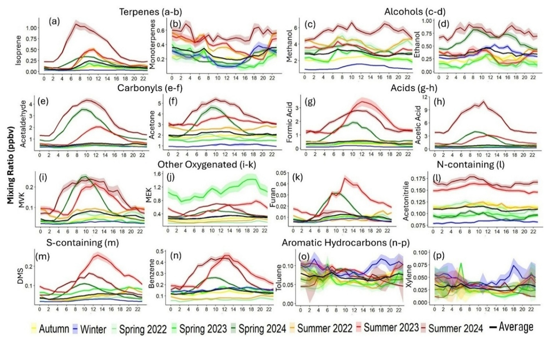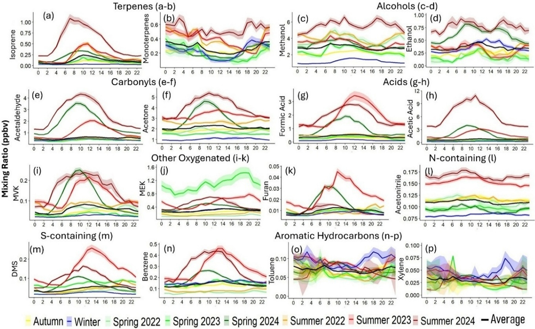 Figure 4Diurnal profiles (hourly averages) for mixing ratio (ppbv) of major VOCs. It includes- terpenes (a–b), oxygenated VOCs (alcohols, carbonyls, acids, other oxygenated (c–k)), nitrogen and sulfur-containing VOCs (l–m), and aromatic hydrocarbons (n–p), measured at a rural background site in Cyprus from 2022 to 2024. Seasonal variations are color-coded, highlighting year-wise spring and summer trends alongside autumn, winter, and overall averages. Shaded areas indicate standard error for median values. x-axis here reprents time in hours in UTC. The VOCs selected in this figure serve as representative indicators for their respective chemical families.