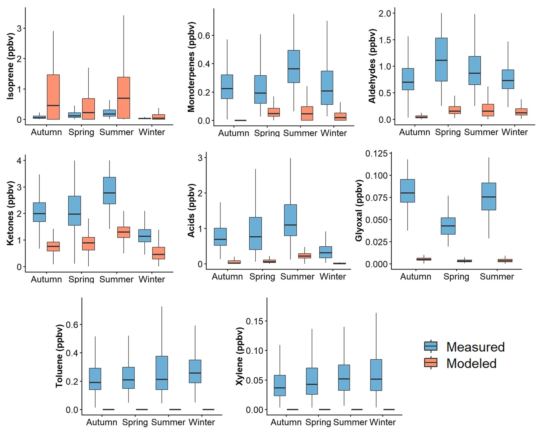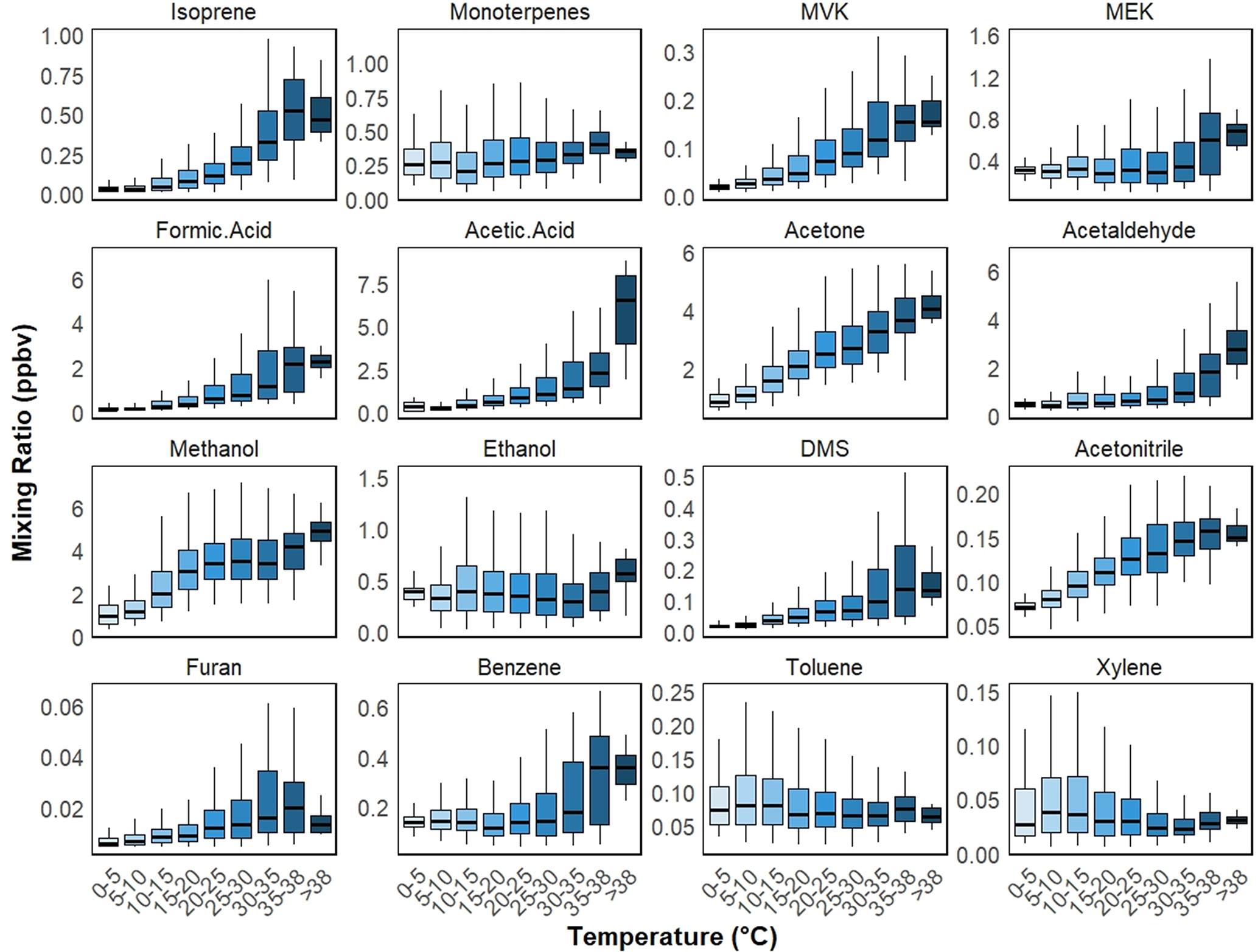 Figure 5Temperature Dependence of Ambient VOC mixing ratio in Cyprus. Box plots showing the variation in ambient mixing ratio (in ppbv) of selected VOCs across different temperature ranges (°C) at a rural background site in Cyprus. Each box represents the interquartile range (IQR) with the median marked, and whiskers indicating variability outside the upper and lower quartiles. The VOCs selected in this figure are serve as representative indicators for their respective chemical families.