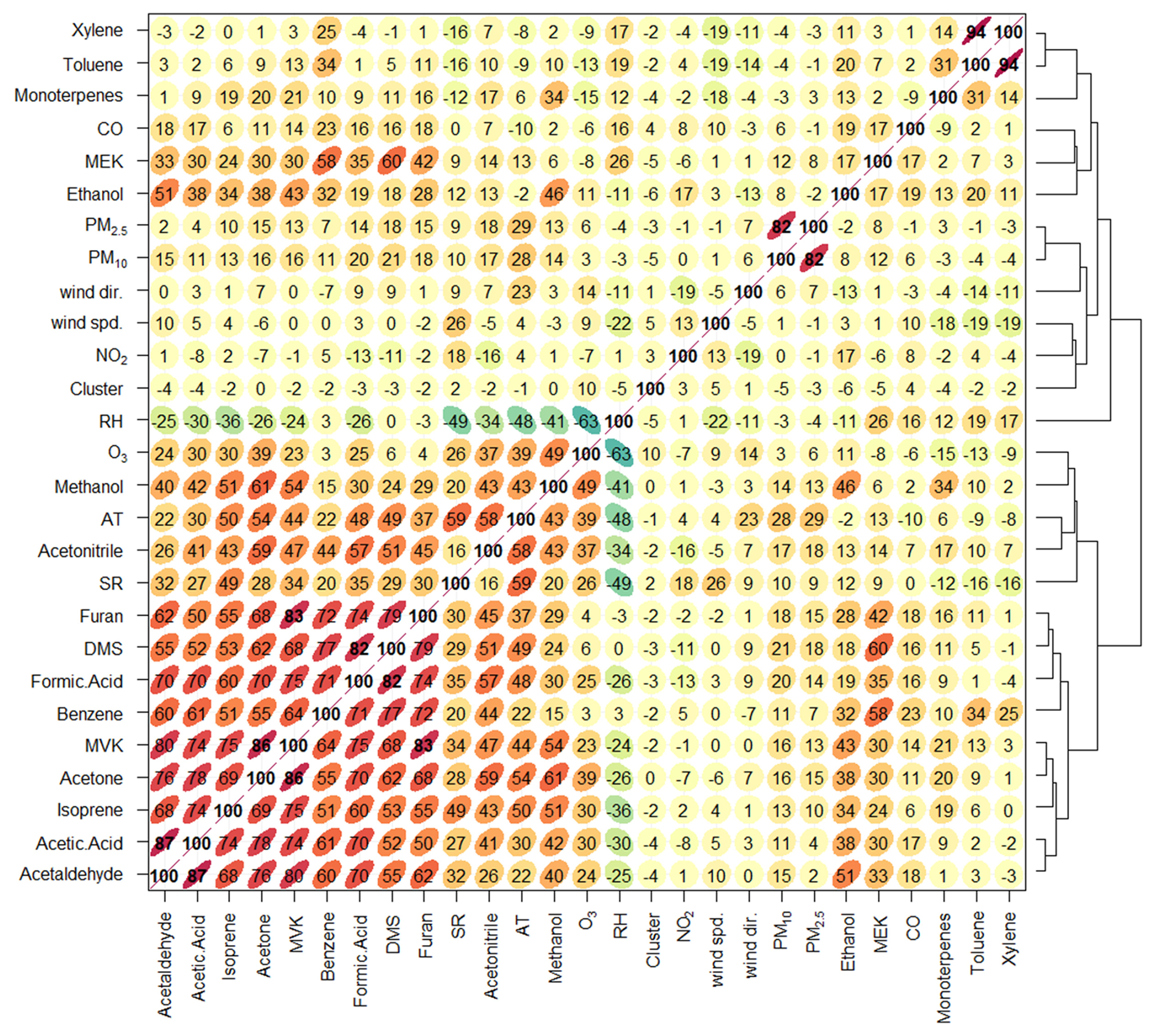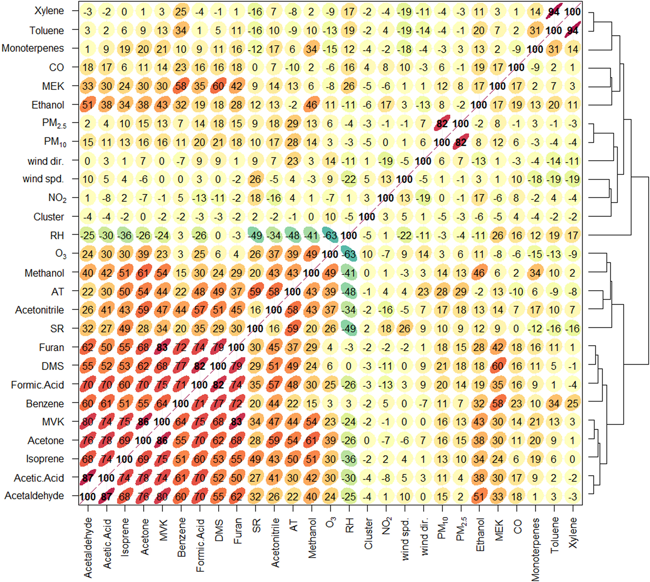 Figure 6Correlation matrix and hierarchical clustering of VOCs, meteorological parameters, and air pollutants. Pearson correlation matrix illustrates the relationships among VOCs, meteorological variables (e.g., temperature, solar radiation, humidity), and air pollutants (NO2, O3, CO, PM2.5, PM10). Here, cluster refers to the air-mass trajectory cluster index obtained from the HYSPLIT back-trajectory analysis (shown in Fig. 7), where each number corresponds to a distinct air-mass transport pathway. Positive correlations are shown in orange to red, while negative correlations are represented in green to blue. Hierarchical clustering (dendrogram) on the right group's variables with similar correlation patterns.