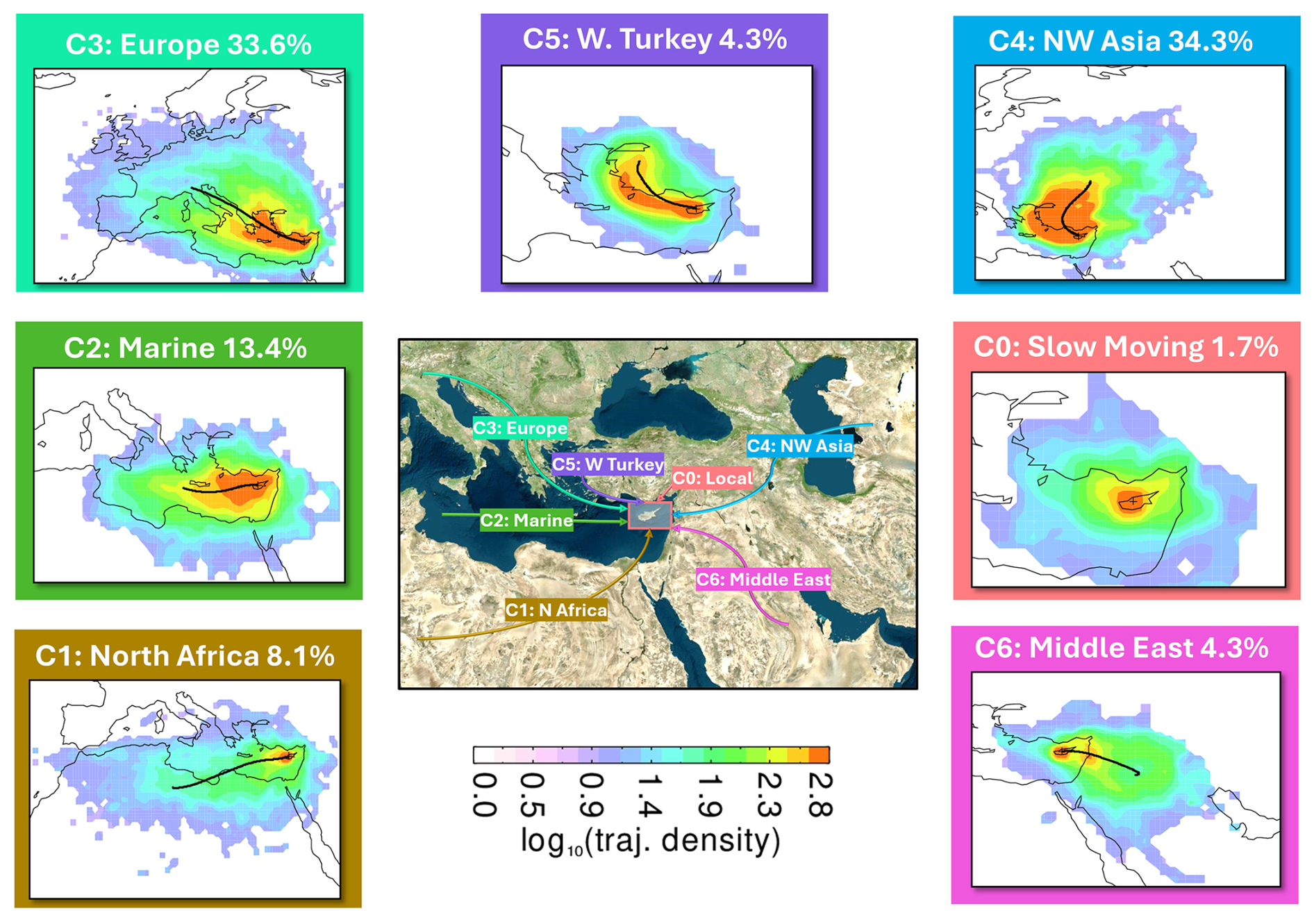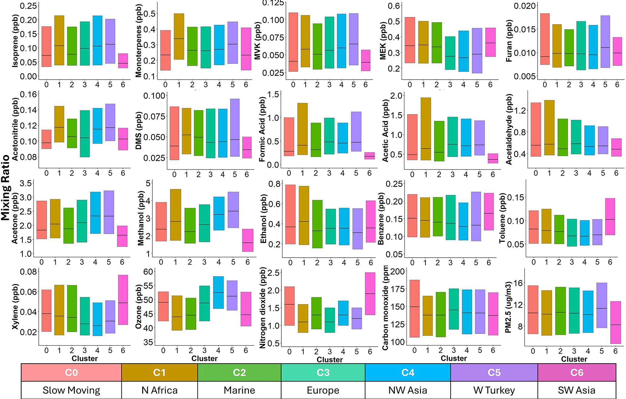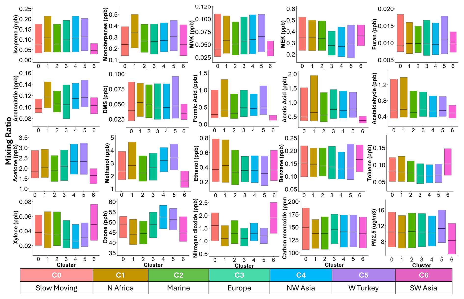 Using the HYSPLIT model to calculate air mass backward trajectories, we identified seven air mass clusters (Fig. 7) influencing VOCs transport and composition over Cyprus. The dominant clusters originated from Northwest Asia (C4, 34.3 %) and Europe (C3, 33.6 %), jointly accounting for more than two-thirds of the long-range air mass transport. These clusters represent strong, recurrent long-range synoptic-scale transport from urbanized and industrialized continental regions, which occur more frequently than locally influenced trajectories, and thus playe a key role in shaping seasonal and spatial VOC variability. Marine-influenced air masses (C2, 13.4 %) reflected mixed characteristics, carrying both marine biogenic signatures and aged anthropogenic pollution. Less frequent clusters included air masses from North Africa (C1, 8.1 %), Western Turkey (C5, 4.3 %), Middle East (C6, 4.3 %), and stagnant local conditions (C0, 1.7 %). Notably, C6, although infrequent overall, was more prevalent during winter (10.7 %) and exhibited elevated levels of benzene, toluene, and xylenes (BTX) during winter, suggesting long-range transport of aromatic hydrocarbons from the Middle East (Fig. 8). C0, characterized by low wind speeds and residence near the site, showed high concentrations of primary pollutants such as benzene, acetonitrile, ethanol, and NO2, consistent with local anthropogenic and biomass burning sources. Despite dominant local Northwest winds (as shown in Windrose diagram Fig. 2d), back trajectories show multi-day synoptic transport. The more frequent large-scale flows (C3–C4) therefore contribute over two-thirds of long-range air mass transport, exceeding the influence of local pathways (C1–C2). Distinct chemical signatures were observed across clusters. European clusters (C3) exhibited elevated OVOCs such as methanol, acetone, and acetic acid, indicating the presence of aged air masses and secondary formation processes. C3 also carried higher levels of isoprene and MVK, possibly from transported biogenic emissions. C4 was associated with elevated O3, potentially due to photochemical aging during long-range transport. In contrast, Western Turkey (C5) air masses had generally low VOC mixing ratios, though slight O3 enhancement was observed, possibly due to regional NOx-rich emissions and transport.