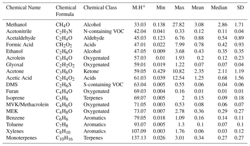 The instrument was automatically switched to measure VOC-free air for 20 min after every 23 h, followed by 40 min of calibration using a certified gas standard (Apel-Riemer Environmental, USA) containing major VOCs diluted to ∼ 20 ppbv; this 23 h cycle caused the non-measurement period to shift by approximately 1 h each day, ensuring that no specific time of day was systematically underrepresented and that diurnal patterns were not biased. VOCs not included in the gas standard were calibrated using established relative response factors determined from prior laboratory experiments and, where possible, verified with secondary standards. Mass spectra were acquired at 1 min time resolution and averaged to 1 h intervals for the analysis in this study. The instrument sensitivity was interpolated between calibrations and adjusted for humidity dependence based on water cluster ion ratios. Calibrated sensitivities showed modest temporal variability (∼ 10 %–23 %) for most compounds. Post-acquisition analysis was carried out using the Ionicon data analyzer (IDA), with mass axis calibration based on H3O+ and internal reference peaks (e.g., C6H5I+). The software retrieved exact masses and chemical formulas for ∼ 1200 peaks, of which 400–500 were assigned tentative structures using the GLOVOCS database, which is a master compound assignment guide that can be referred to as PTR-MS practitioners (Yáñez-Serrano et al., 2021). A set of 131 common species across analysis periods was further corrected using transmission curves derived from zero and calibration air sampling. Mixing ratios (ppbv) were calculated from ion counts, incorporating species-specific reaction rate constants (k-values) based on molecular dipole moments and polarizabilities (Desservettaz et al., 2023; Pagonis et al., 2019). The limit of detection (LOD) for each species was defined as three times the standard deviation observed during zero-air measurements and averaged over the entire campaign. VOC species with more than 30 % of their data below the LOD were excluded, resulting in a final dataset of 76 species, with sub-LOD concentrations appropriately flagged. Measurements impacted by filter changes, exhibiting short-term interference (notably acids and certain hydrocarbons), were filtered by removing a conservative 2 h window following each swap. Formaldehyde was not included in this study due to its inconsistent identification by the IDA software during part of the measurement period. Furthermore, quantification of formaldehyde via PTR-based techniques is known to be highly sensitive to humidity variations (Vlasenko et al., 2010), which complicates reliable detection. Accurate quantification would require water-dependent calibrations and a dedicated formaldehyde calibration standard, conditions that were not met during the measurement period.