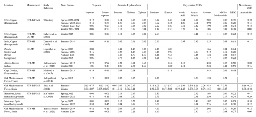 As shown in Table 2, VOC mixing ratios measured in our study are within the range reported from other European background and rural sites. Winter mixing ratios for acetaldehyde, acetone, MVK, MEK, acetonitrile, benzene, isoprene, and monoterpene were also comparable to those measured during the same period in 2015 at this site (Debevec et al., 2017), suggesting stable background concentrations and low interannual variability in the Eastern Mediterranean. However, summertime isoprene mixing ratios at Ineia, Cyprus, were about three times lower. Derstroff et al. (2017) demonstrates potential contribution of downwind forest emissions or the effect of hotter summers and stress induced emissions. Elevated levels of most VOCs during summer (Fig. 3b) suggest the influence of increased biogenic activity and enhanced photochemical production, as well as contributions from solvent use and fuel evaporation.