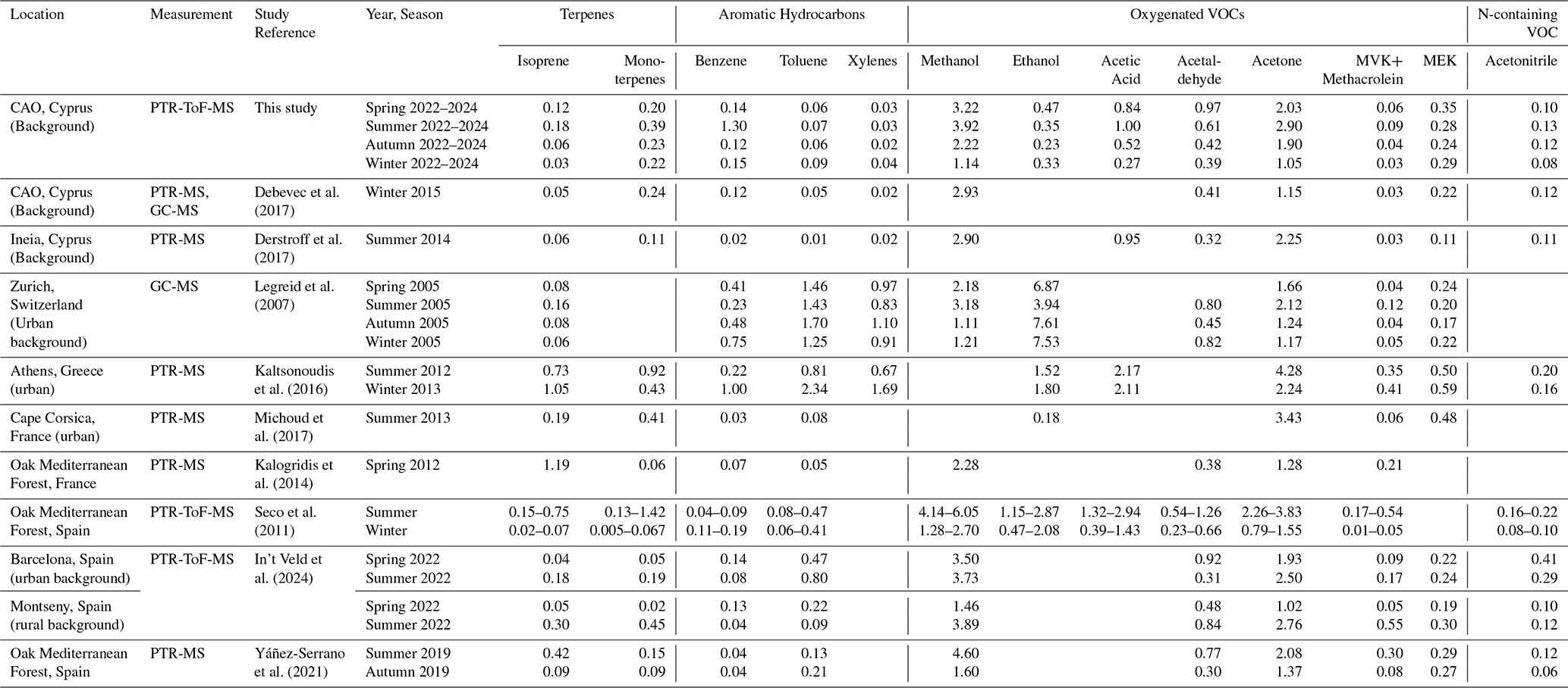 As shown in Table 2, the Mediterranean forested sites in France and Spain are characterised by higher daily mean isoprene levels up to 1 ppbv (Kalogridis et al., 2014; Seco et al., 2011), consistent with strong direct emissions from oak-dominated ecosystems compared to the conifer-dominated forest in Cyprus. The urban site of Zurich, Switzerland shows similar seasonal pattern as our study, where isoprene, methanol, acetone, and MVK all showed a summer maximum and a winter minimum (Legreid et al., 2007). However, wintertime aromatic (BTX) concentrations were much higher in Zurich presumably due to combustion sources related to anthropogenic activities. Nitriles and MEK concentrations in our study fall in the range of those reported for previous European background studies (Table 2) and confirm their regional well-mixing as resulting from both anthropogenic and biomass-burning sources.