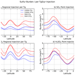 As for SO2 injections, regional injections initially constrain more mass in the tropics, resulting in a maximum aerosol burden (Figs. 1c, d, A1). In contrast, point injections result in more mass in mid-to-high latitudes. In comparison to SO2 injections, AM-H2SO4 injections show more than a doubling of the sulfur burden for regional injections in MAM4, which aligns with the reduced effective radius resolution and less sedimentation. In contrast, the burden of point injections is similar to that of SO2 injections, with a similar effective radius.