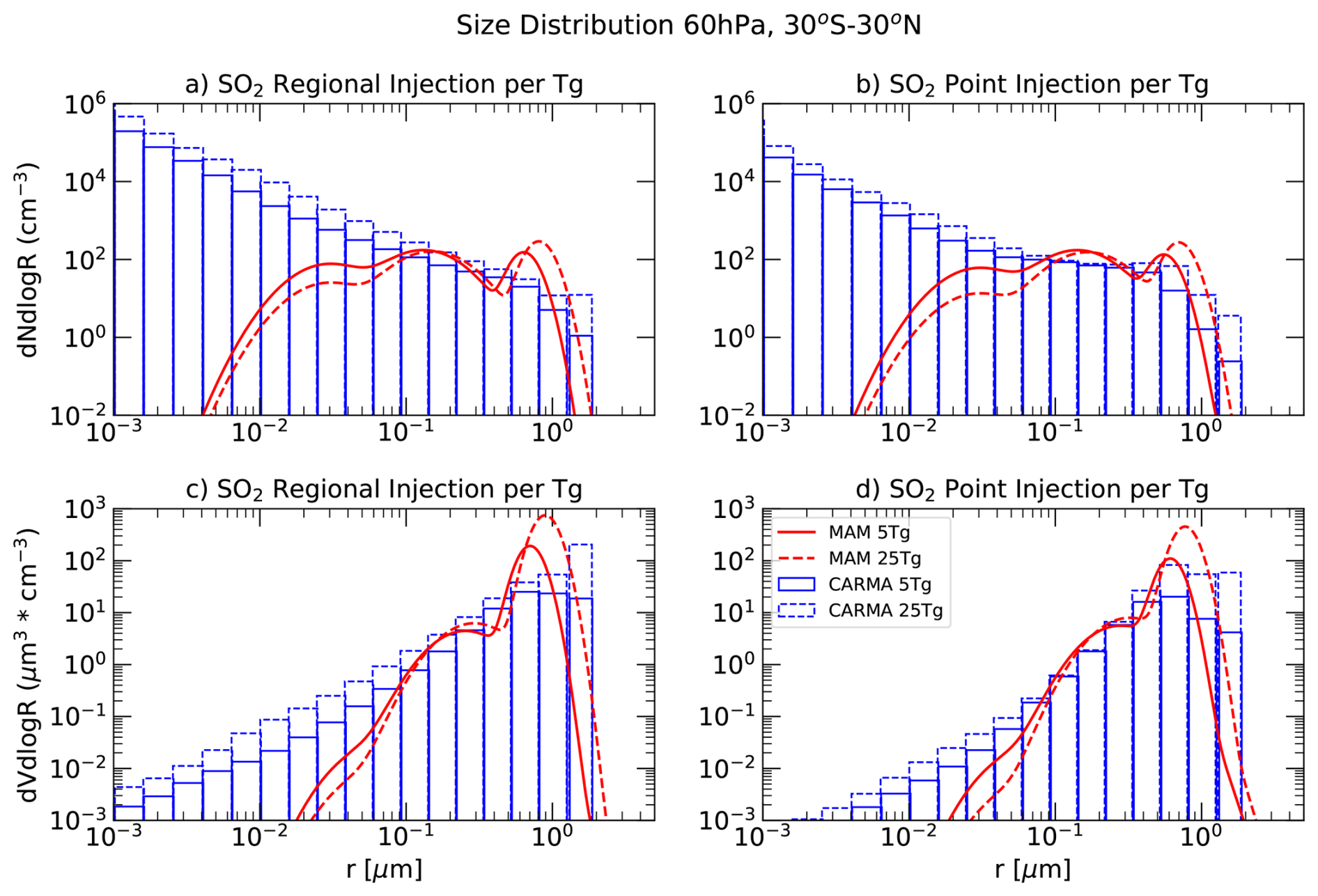 Figure 3Size distribution for SO2 injection experiments shown as (particles cm−3, panels a, b) and (cm−3 µm−1, panels c, d), at 60 hPa, averaged between 30° N and 30° S. Results are shown for CARMA (blue) and MAM4 (red), comparing different injection locations (regional injections on the left, point injections on the right), and for varying injection amounts (5 Tg S yr−1, solid lines; 25 Tg S yr−1, dashed lines).