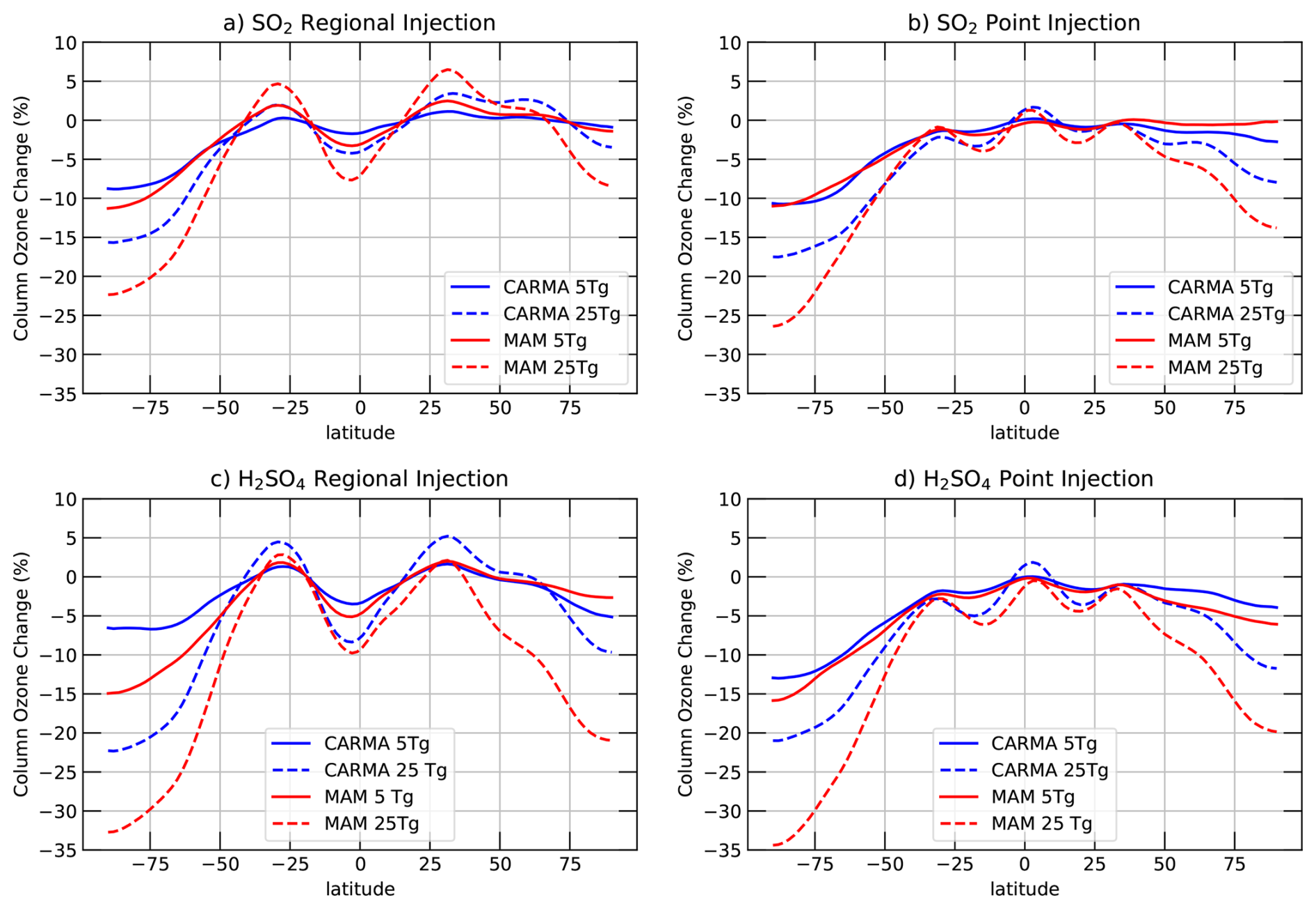 Figure 6Annual relative changes in total column ozone (TCO) compared to the control for CARMA (blue) and MAM4 (red), and for different injection locations (regional injections: panels a, c, point injections: panels b, c), different injection material (SO2: panels a, b, AM-H2SO4: panels c, d), and for different injection amounts (5 Tg S yr−1: solid, 25 Tg S yr−1: dashed), assuming 2040 halogen and greenhouse gas emissions.