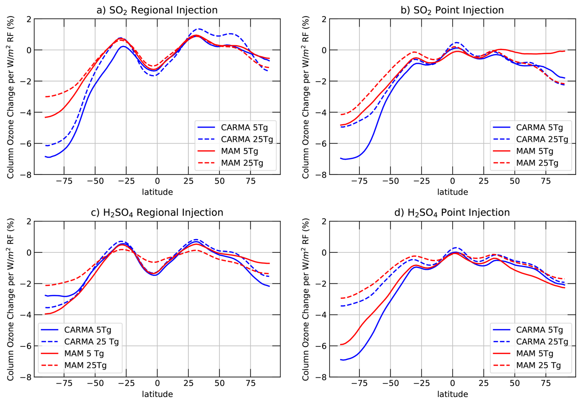 Figure 7Annual relative changes in total column ozone (TCO) compared to the control divided by the net top-of-the-atmosphere radiative forcing resulting from the sulfur injections for CARMA (blue) and MAM4 (red), and for different injection locations (regional injections: panels a, c, point injections: panels b, c), different injection material (SO2: panels a, b, AM-H2SO4: panels c, d), and for different injection amounts (5 Tg S yr−1: solid, 25 Tg S yr−1: dashed), assuming 2040 halogen and greenhouse gas emissions.