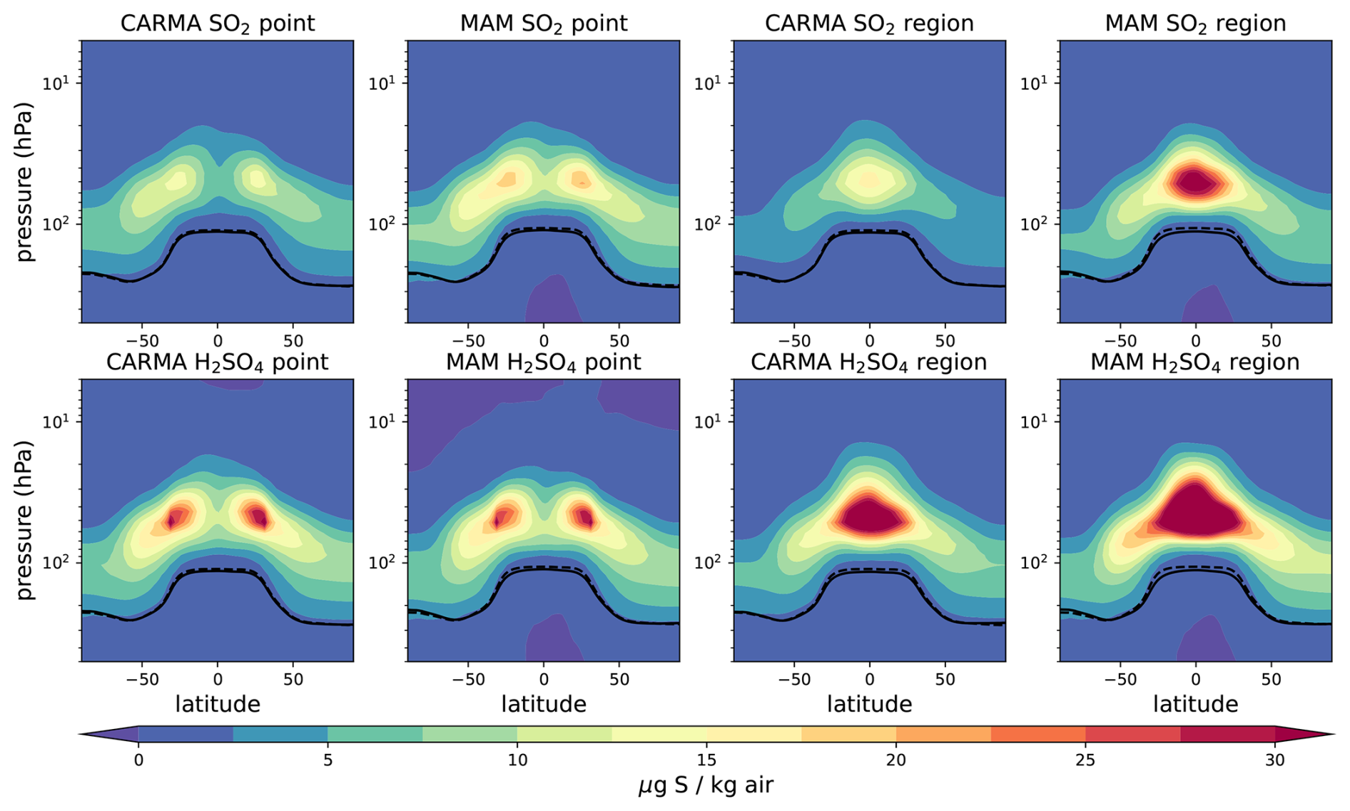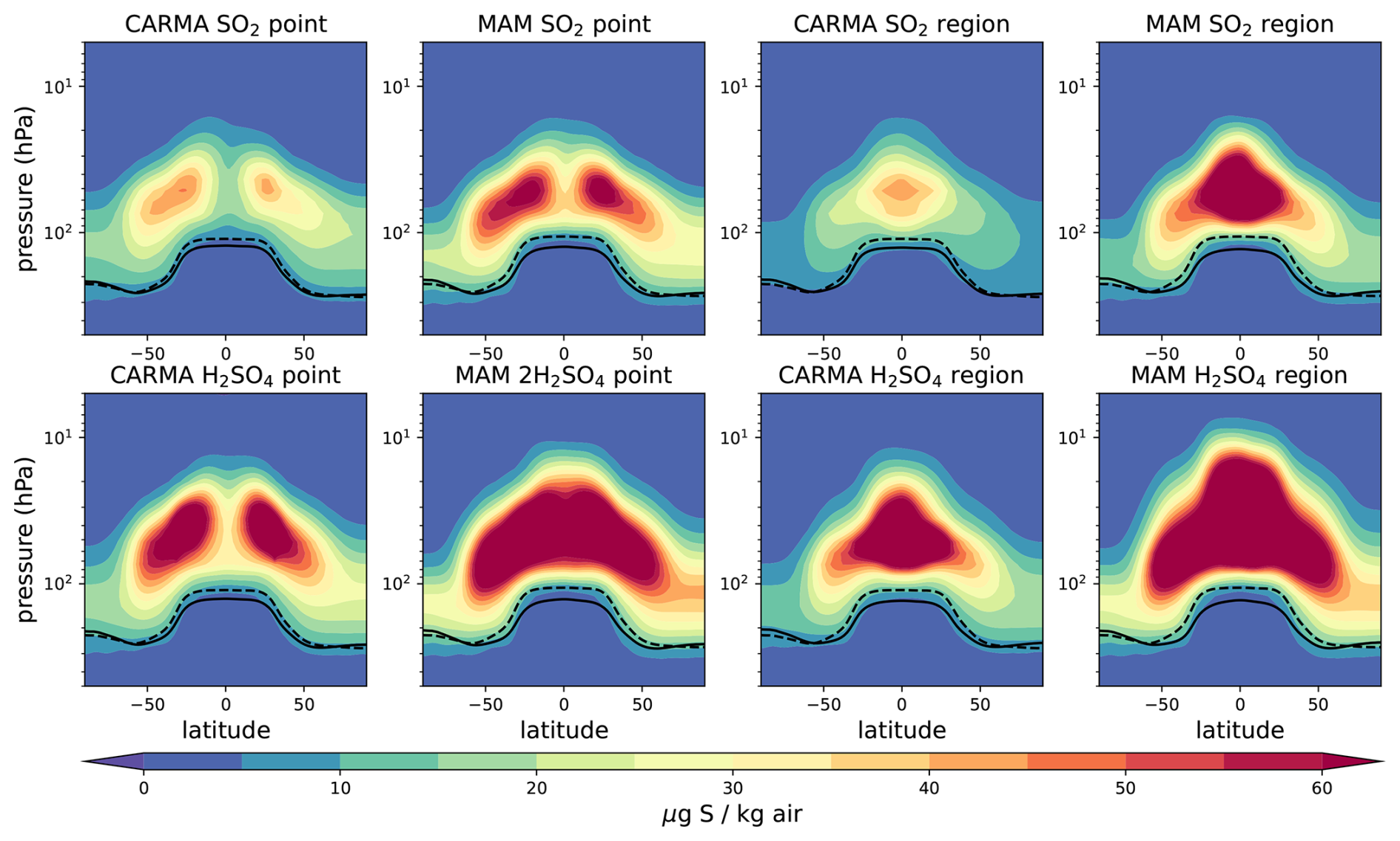 Figure A2Zonal mean sulfate aerosol mixing ratios for different 25 Tg S injection experiments minus the control in µg S kg−1 air. The tropopause of the control experiment and the injection experiments are illustrated as black solid and dashed lines, respectively.