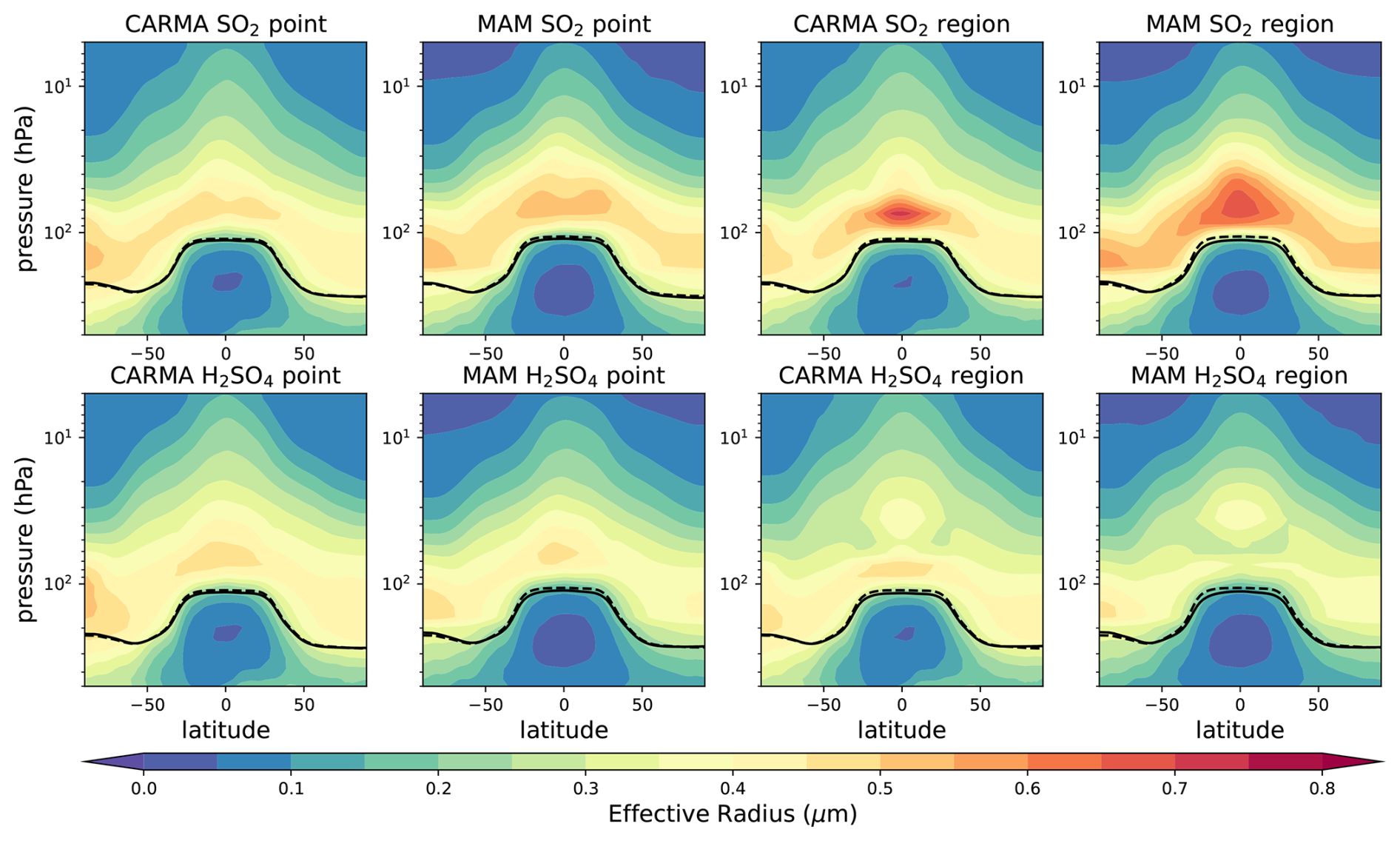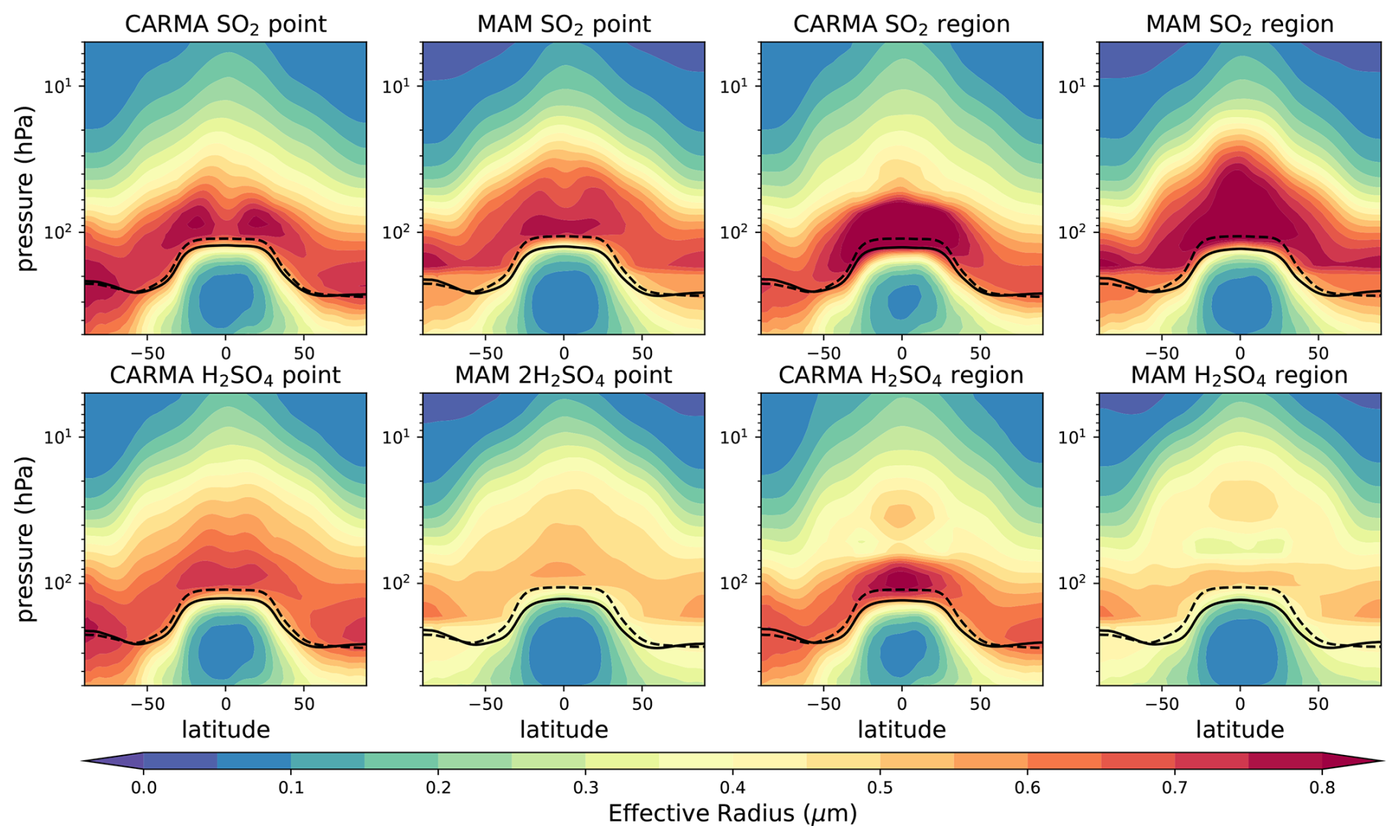 Figure A4Zonal mean effective radius distribution in µm for different 25 Tg S injection experiments. The tropopause of the control experiment and the injection experiments are illustrated as black solid and dashed lines, respectively.