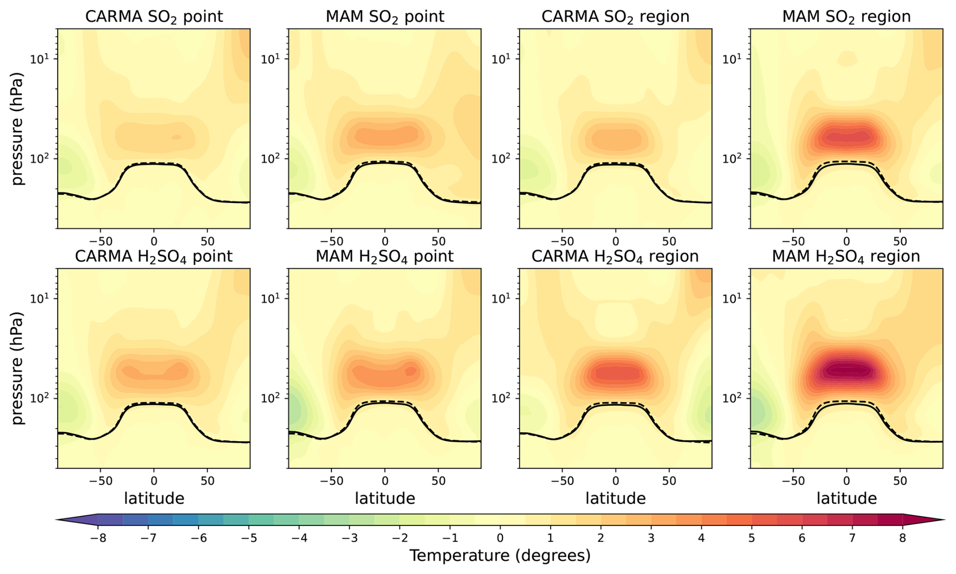 Figure A5Zonal mean temperature differences for different 5 Tg S injection experiments minus the control in degrees Celsius. The tropopause of the control experiment and the injection experiments are illustrated as black solid and dashed lines, respectively.