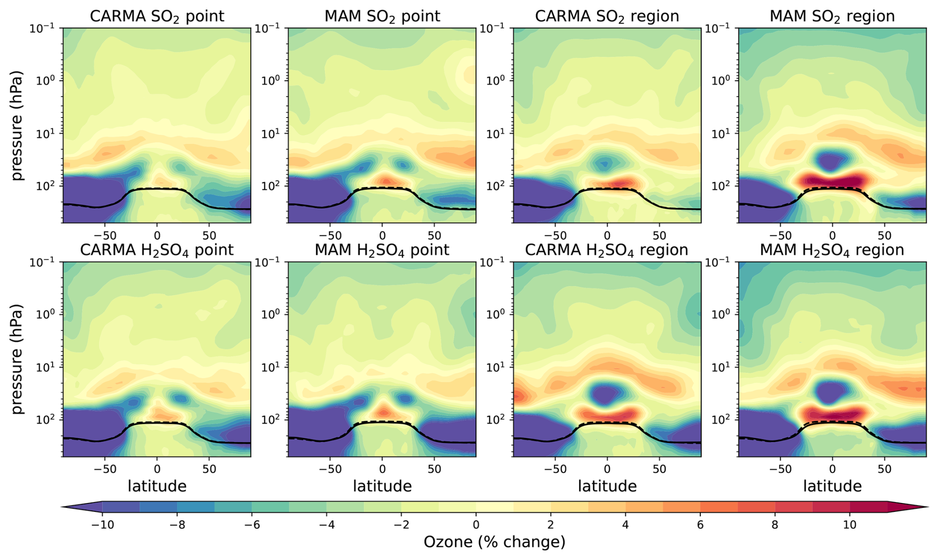 Figure A6Zonal mean ozone mixing ratio relative differences for different 5 Tg S injection experiments minus the control in percent. The tropopause of the control experiment and the injection experiments are illustrated as black solid and dashed lines, respectively.