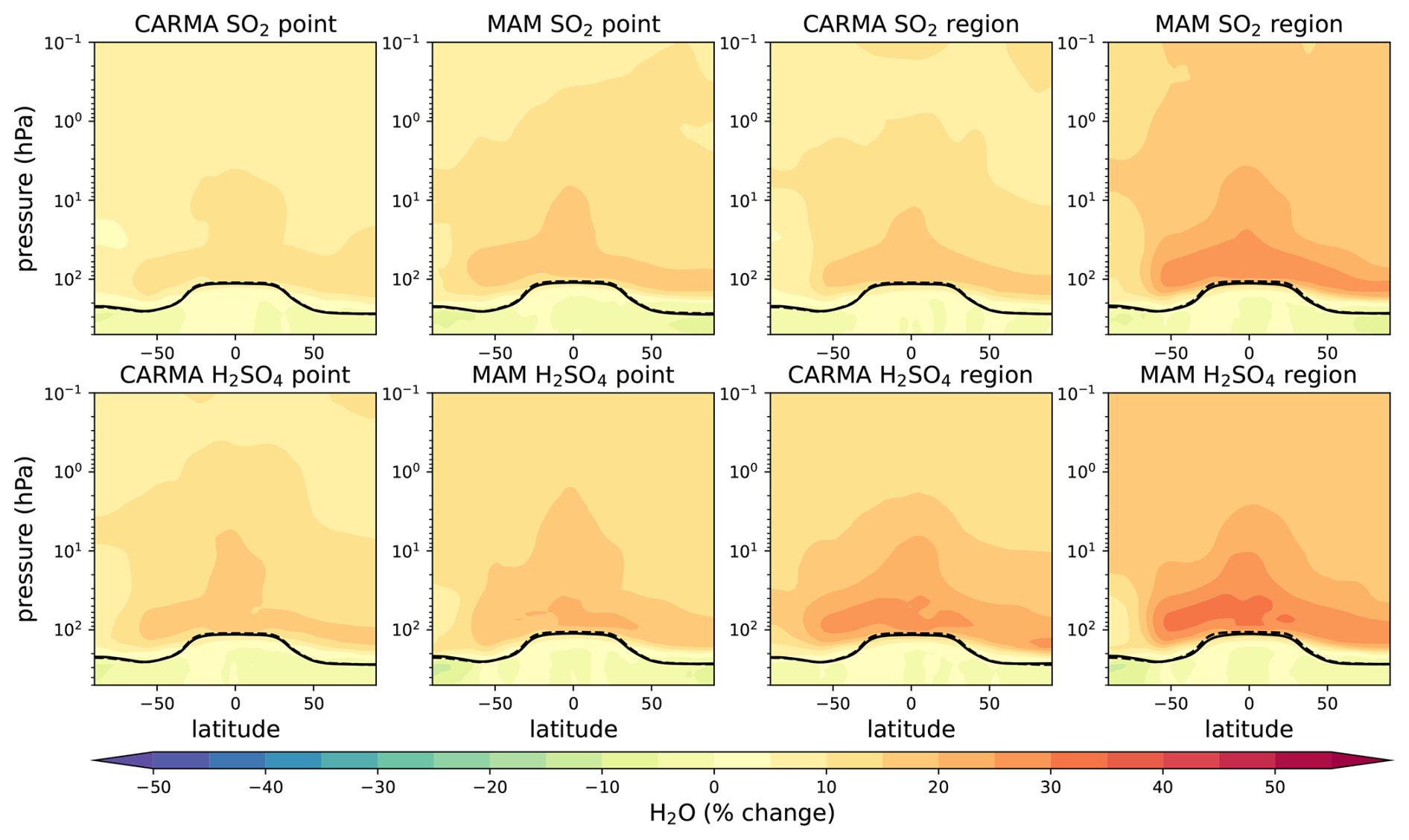 Finally, the effects of SAI on TCO differ depending on the injection region, location, and amount of injection. However, comparing the TCO change with regard to the net top-of-the-atmosphere radiative forcing reduction per experiment reveals smaller differences between the various injection strategies, with point injections at 30° N and 30° S showing slightly larger TCO reductions in high latitudes for 5 Tg S yr−1 injections. Differences between CARMA and MAM4 are considerable, with CARMA generally showing larger TCO in high latitudes. Significantly more ozone loss occurs in the tropics due to regional injections, resulting in larger changes in heating and transport.