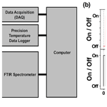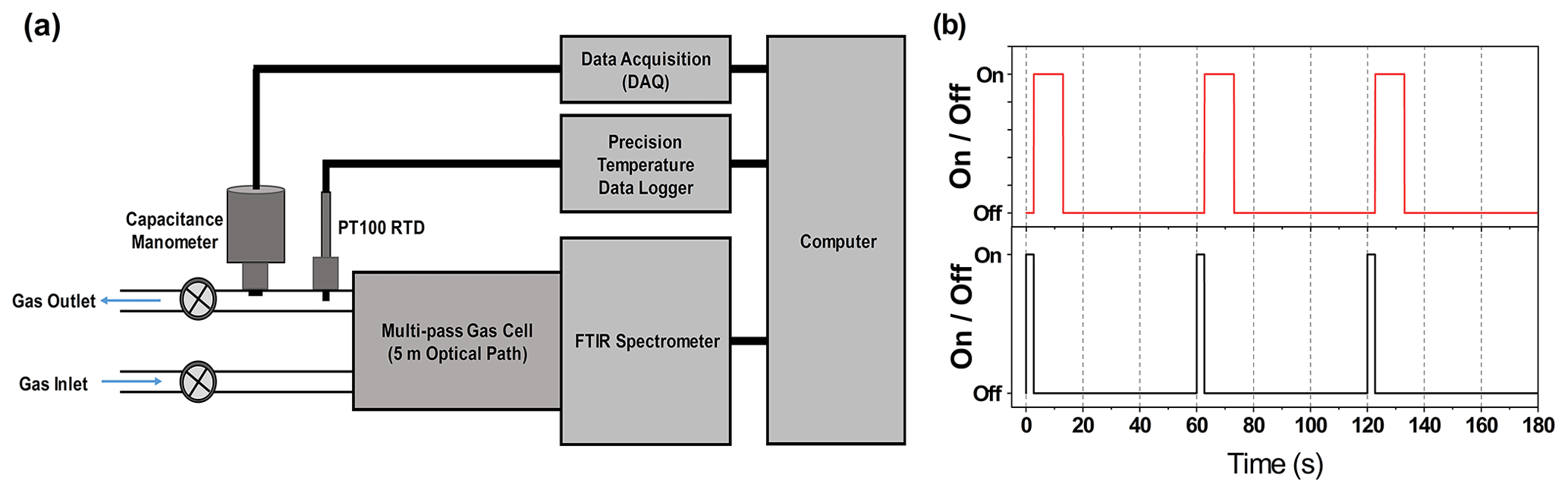 Figure 1Schematic representation of the experimental system and its measurement sequence. (a) Experimental setup consisting of an FTIR spectrometer, a capacitance manometer with data acquisition (DAQ), and a PT100 RTD sensor with temperature logging, all integrated and controlled via LabVIEW for synchronized measurement control. (b) Time sequence of the measurement cycle: each cycle begins with simultaneous pressure and temperature acquisition for 2.7 s (black solid line), followed by FTIR spectral acquisition for 10.3 s (red solid line, 16 scans averaged). The sequence then includes a 47 s idle period before the next cycle begins, resulting in one complete measurement cycle per minute. This protocol yields synchronized pressure, temperature, and infrared absorption spectra at 1 min intervals.