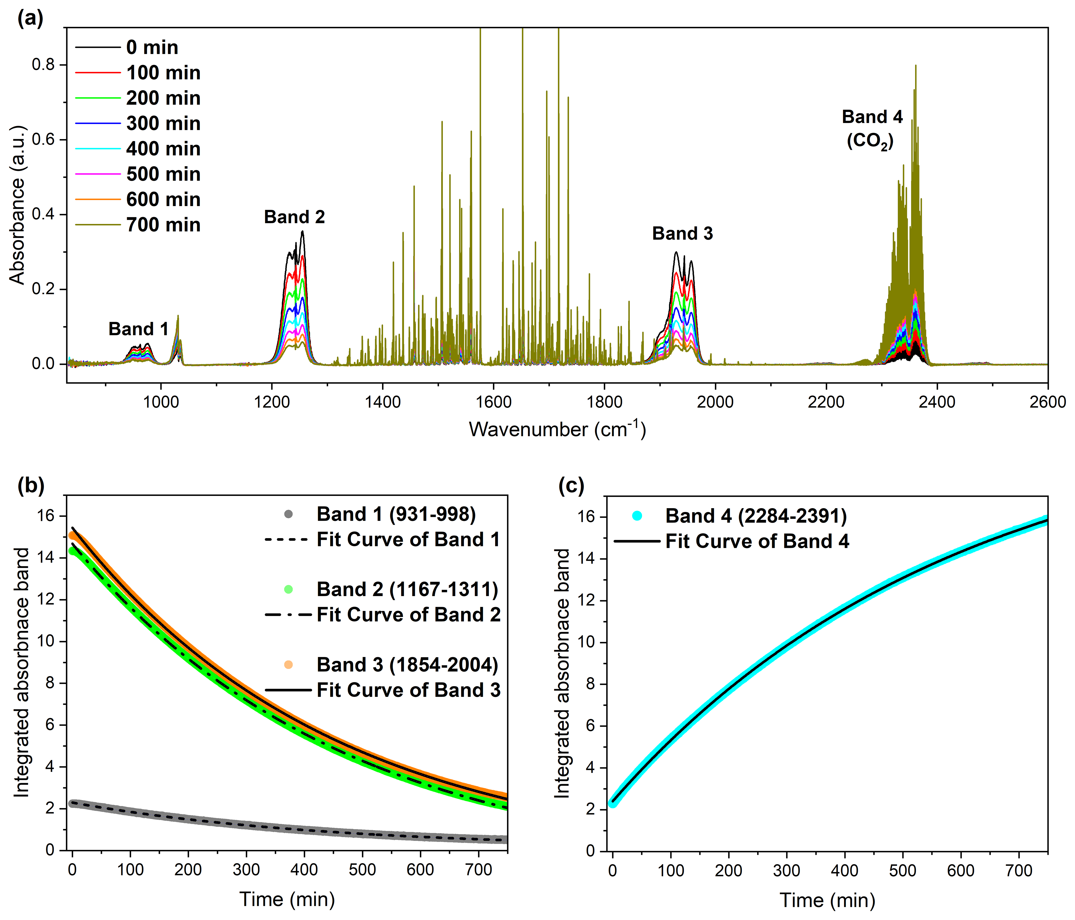 Figure 3Infrared spectroscopic analysis of the reaction between carbonyl fluoride (COF2) and molecular oxygen (O2), showing both the depletion of COF2 and the formation of CO2 over time. (a) Time-resolved infrared absorbance spectra of COF2 during its reaction with O2, showing the gradual decay of COF2 and concurrent increase in CO2 absorption features. Spectra were recorded at 100 min intervals up to 700 min. (b) Integrated absorbance of COF2 bands (Band 1: 931–998, Band 2: 1167–1311, Band 3: 1854–2004 cm−1) as a function of time, illustrating the exponential decay of COF2. (c) Integrated absorbance of the CO2 band (Band 4: 2284–2391 cm−1), indicating the formation and accumulation of CO2 over time.