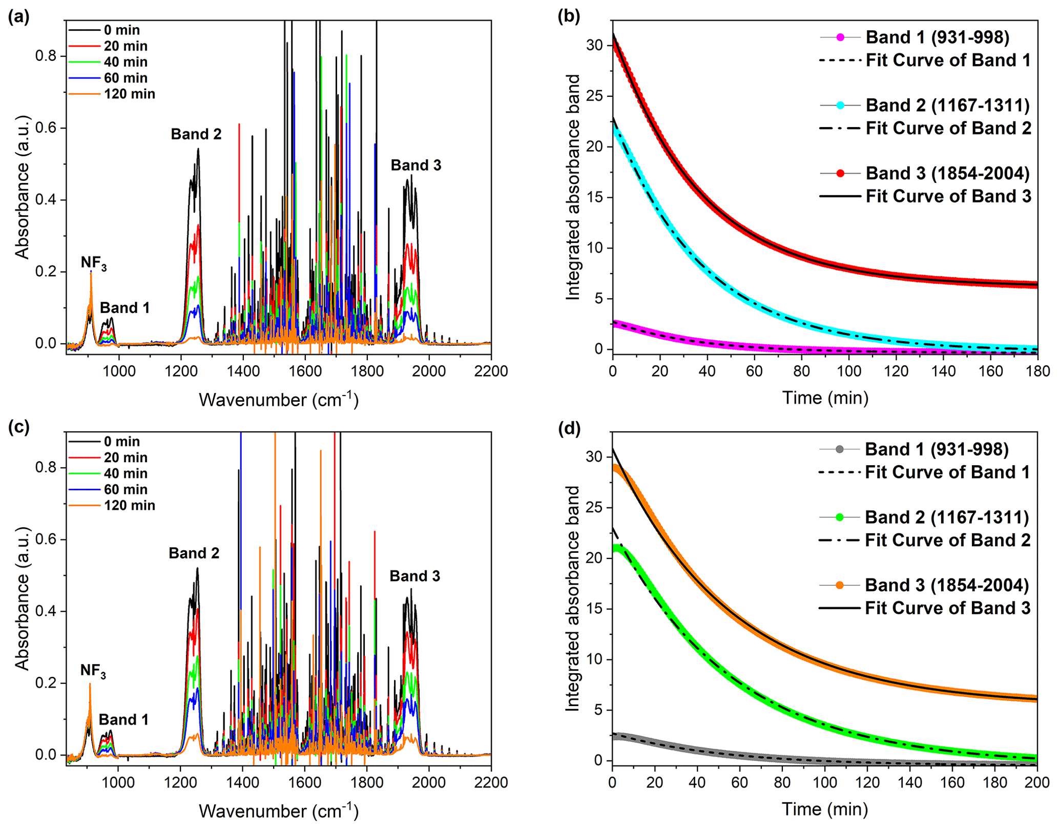 Figure 4Atmospheric degradation behavior of COF2 under ambient air conditions, illustrating the influence of atmospheric moisture on the reaction kinetics. (a, b) Spectral and kinetic analysis of COF2 decay measured in the morning, when the relative humidity was higher. (a) Time-resolved FTIR absorbance spectra showing the decay of COF2 features. (b) Integrated absorbance of three representative COF2 bands (Band 1: 931–998, Band 2: 1167–1311, Band 3: 1854–2004 cm−1) and corresponding exponential decay fits. (c, d) Measurements taken in the afternoon under relatively lower humidity conditions. (c) Time-resolved spectra showing slower spectral decay. (d) Kinetic profiles of the same COF2 bands as in (b) but highlighting the slower decay under drier atmospheric conditions. These results confirm that the presence of higher ambient moisture accelerates the degradation of COF2 in air. (a, c) Water-vapor–corrected FTIR spectra were obtained by subtracting a background recorded under (a) higher-humidity morning conditions and (c) lower-humidity afternoon conditions; see Supplement for acquisition and subtraction details (Figs. S3–S4).