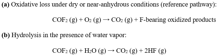 Even when considering only reactions with O2 and H2O, the GWP100 of COF2 remains markedly lower than that of most fluorinated compounds classified as greenhouse gases. Furthermore, because CO2 is the confirmed terminal atmospheric degradation product, the ultimate climate impact of COF2 emissions is effectively equivalent to that of releasing an equal molar quantity of CO2.